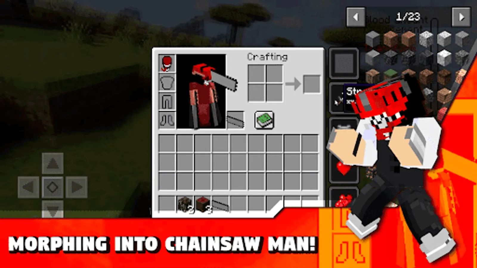 The mod chainsaw man for mcpe is an mod anime that you can bring into the world of mcpe, in chainsaw mod for minecraft you can meet pochita like in the chainsaw man manga. With this chainsaw man for minecraft pe you can morph and add new weapons like the saw machine in your hands, and this chainsaw man mcpe can be used to cut trees faster than using a sword or other tools. Apart from that, with chainsaw man skins for mcpe you can turn into full clothes Denji skin minecraft chainsaw man.
