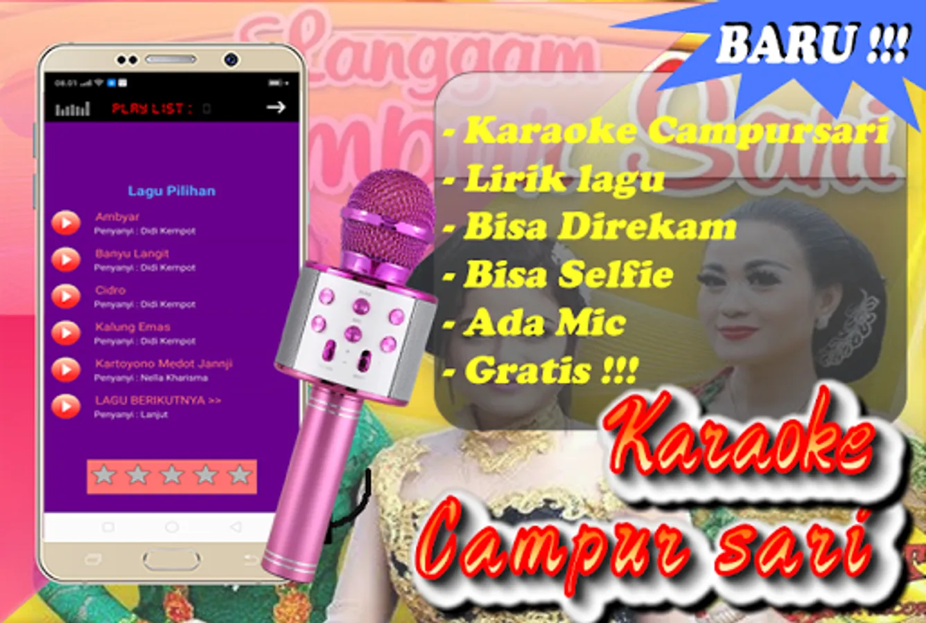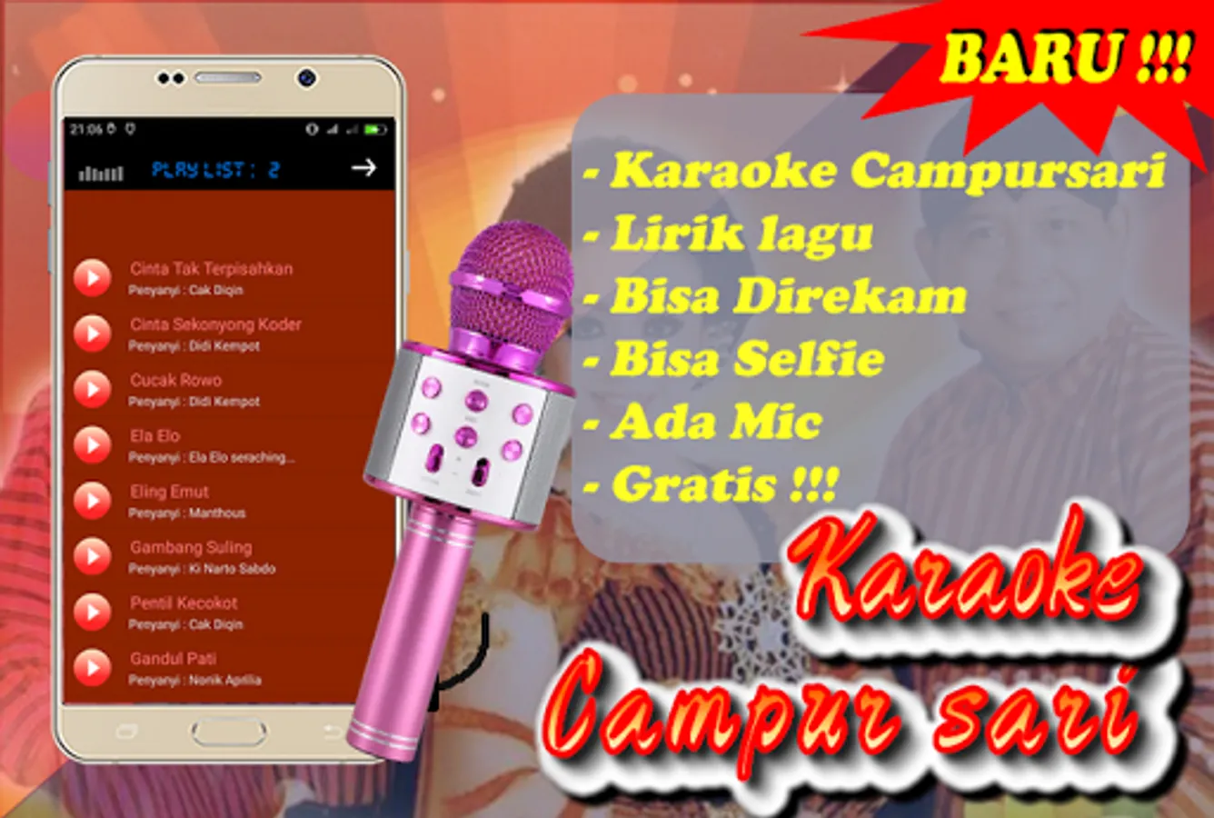 Campursari mp3 karaoke application + lyrics can be recorded and offline is a karaoke application + lyrics and a really cool music player, can be used by all groups, especially lovers of the latest and selected Campursari songs. This application contains a collection of Campursari songs and can karaoke online with the most complete and latest Campursari songs. This application contains campursari songs from famous singers like Manthous, Didi Kempot, Waldjinah etc.
