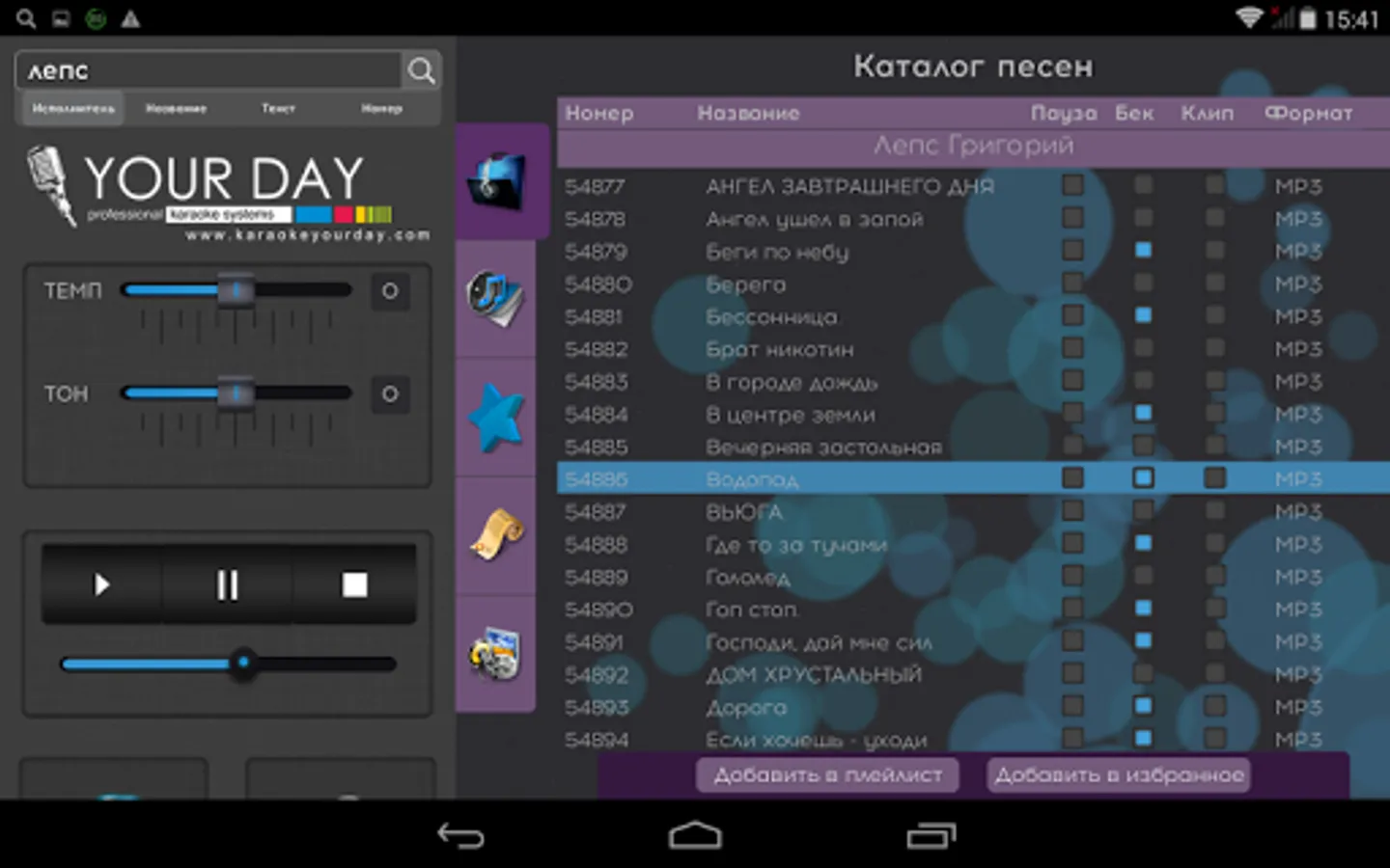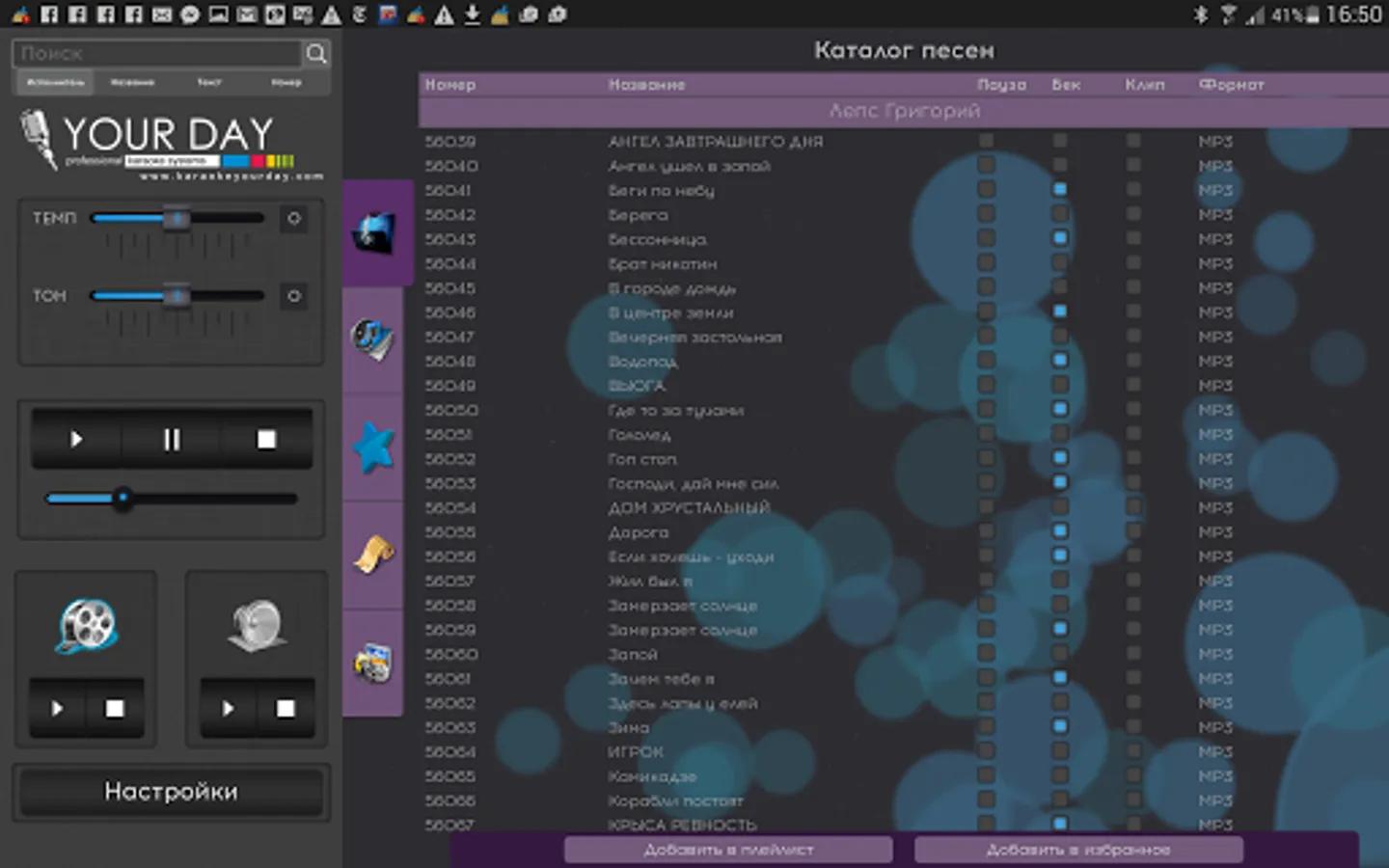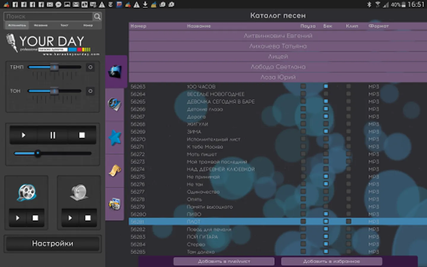 Your Tablet app is designed for remote management from mobile devices to the network WI-FI karaoke systems of Your Day Ltd. Your Day Tablet - a mobile application that allows you to manage karaoke player - Your Day Player. To connect the open karaoke player and set the password to access the settings, after installing this application on your mobile device and run it. Appendix proskandiruet and find available connections in the network automatically. In the window that appears when you have found the network WI-Fi karaoke device, enter your password. Connection is possible in two modes: full and limited. Full, suitable for home and administrative connections. Connection is limited to the plates at the disposal of guests karaoke club, club view the electronic catalog of songs and sorting, adding songs to the tables in the main playlist karaoke player. Using Your Tablet in restricted mode Club guests can make an independent search and order of songs. Paired devices / tablets, unlimited.