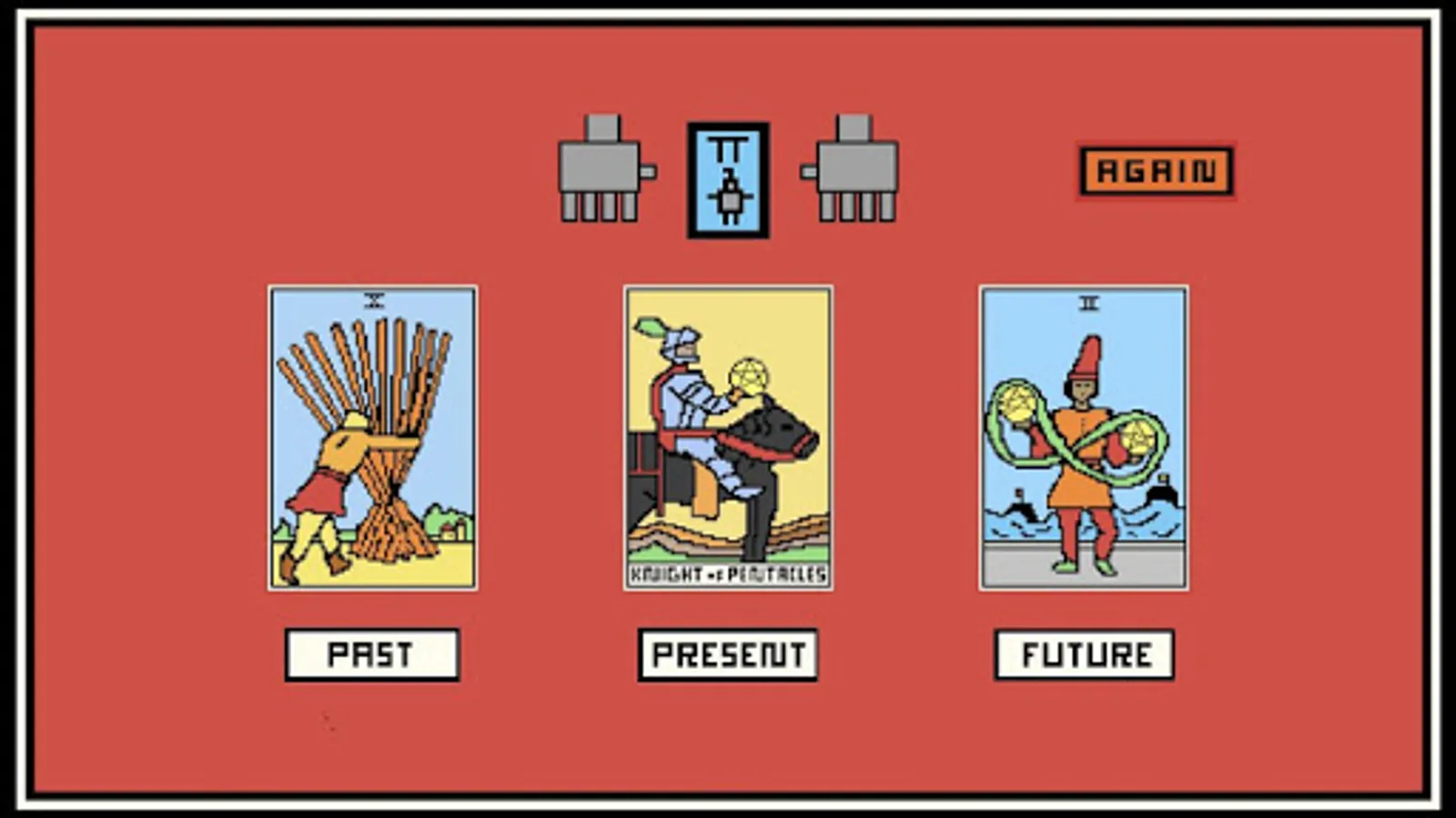 When will you meet the perfect cyborg partner? Should you take the plunge and get a new phone? Is the spirit of your old air conditioner really haunting you? Get your techno-fortune told by the tarot bot and find out! Attune with your device by thinking about your topic then a reading about your past, present and future will be calculated and dispensed.