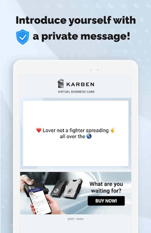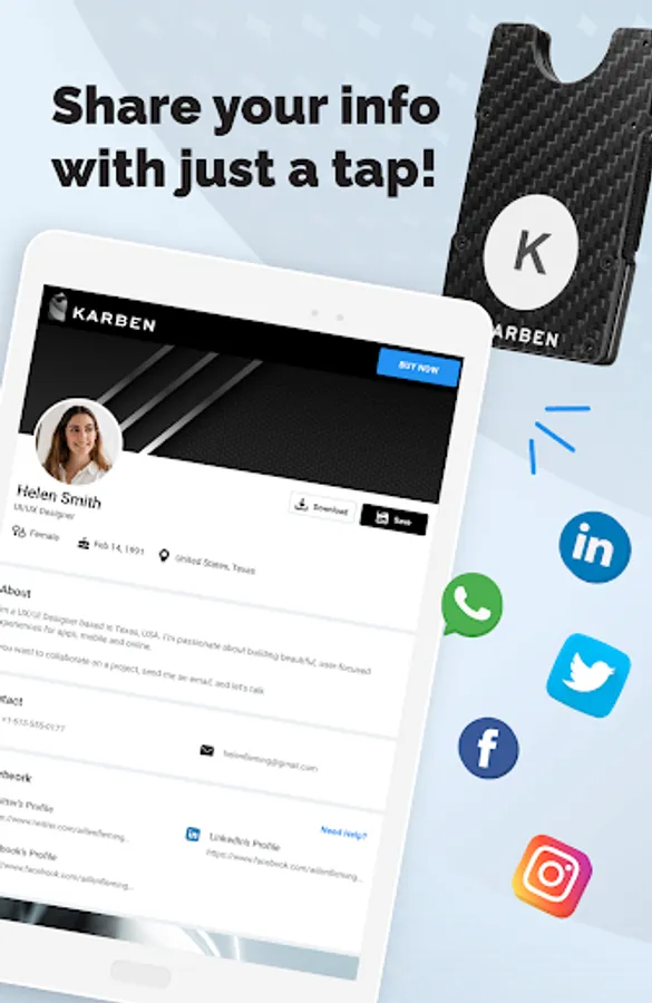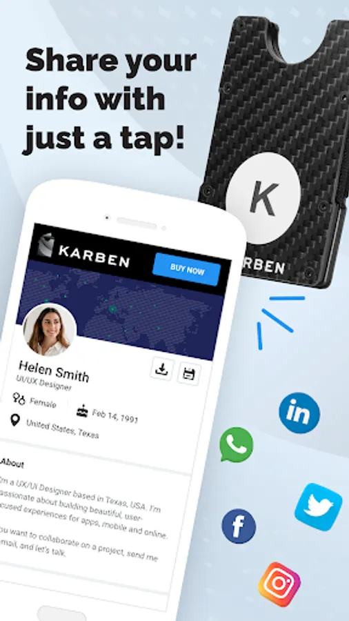Karben App instantly shares your social media and contact details. Just tap your Karben Wallet on someone’s phone. Your information will be transferred to them - even if they don’t have the Karben app! It’s the Virtual Business Card for the 21st century!