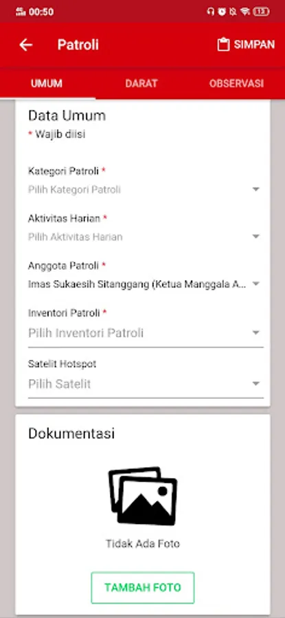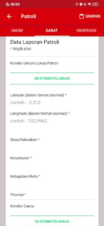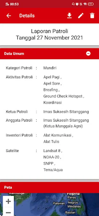 The Karhutla Integrated Patrol Application is a mobile application as a tool for the integrated forest and land fire patrol team in carrying out integrated patrols in the Sumatra region. This application records field data related to general data on patrol activities, daily weather, potential forest and land fires, area accessibility, observation data, outreach, coordination and blackout. Observational data includes tests on vegetation, water sources and soil conditions. The Mobile Application for Integrated Patrol of Karhutla Data Acquisition was developed by the Department of Computer Science FMIPA IPB, in collaboration with the Center for Control of Climate Change and Forest and Land Fires (PPIKHL) for Sumatra Region, Directorate General of Climate Change Control, Ministry of Environment and Forestry, funded by the Fund Management Agency Education, Ministry of Finance of the Republic of Indonesia