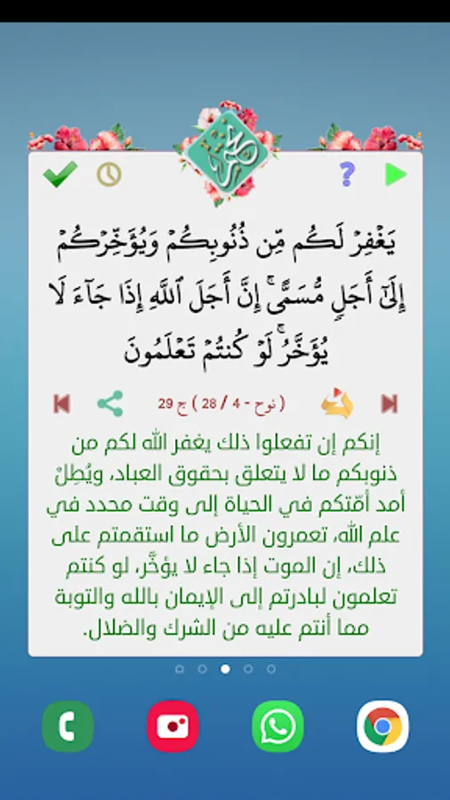 "Nakhtem" app lets you recite the Holy Quran in a smart and easy way. It helps you to spend your time in good deeds like earning rewards as big as mountains, so whenever you want to open your mobile, you are presented with a verse of the Holy Quran from the last verse you read. You can also read its interpretation, and hear it in the voice of your favorite reciter.
