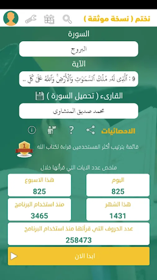 2- يظهر لك احصائيات الآيات التي قرأتها.