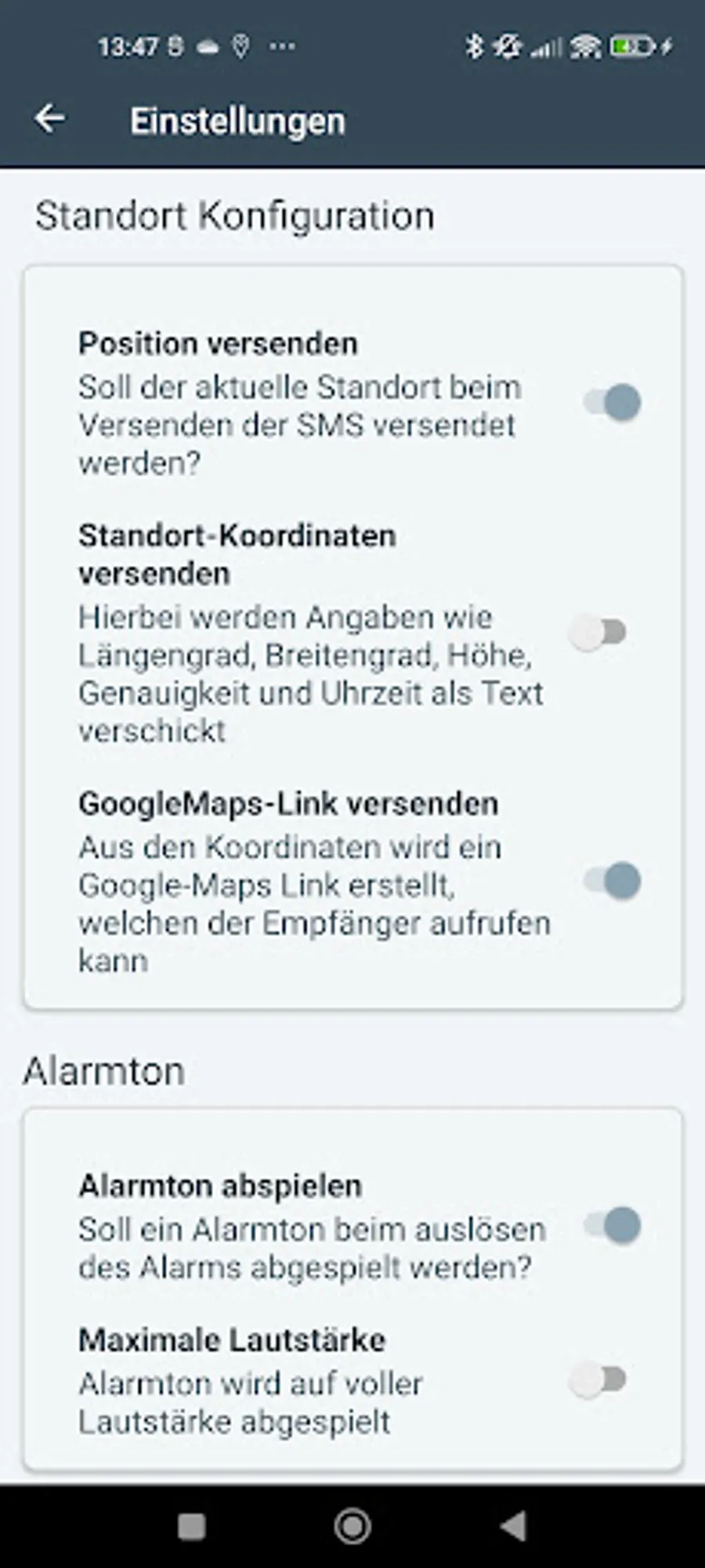 The options for how the location should be sent, whether an alarm tone should be played, etc. can be conveniently set in the settings.