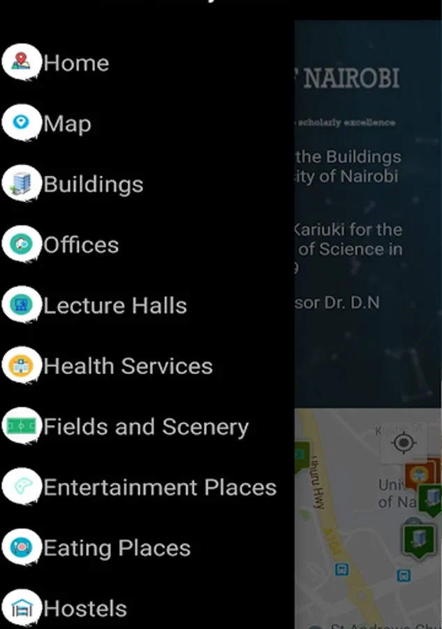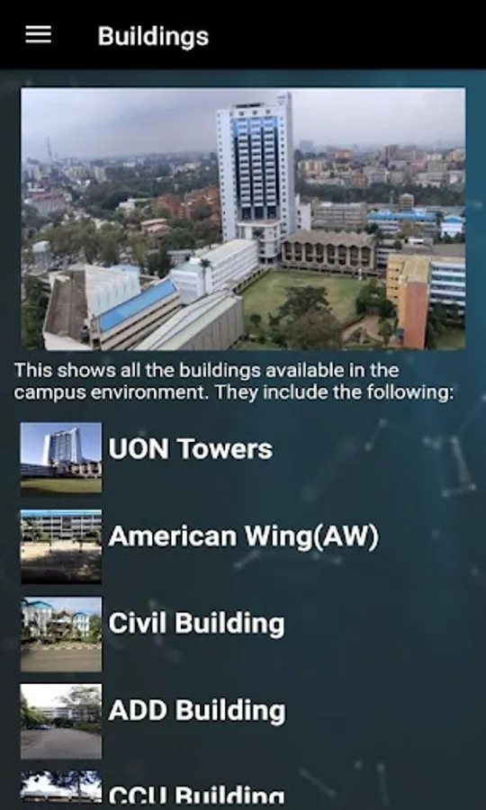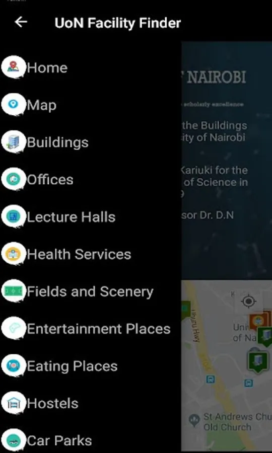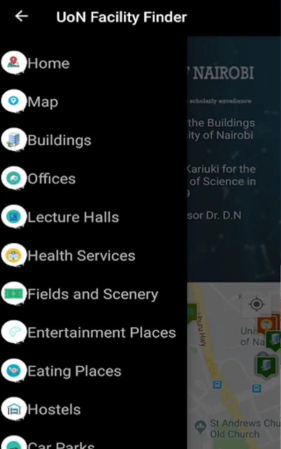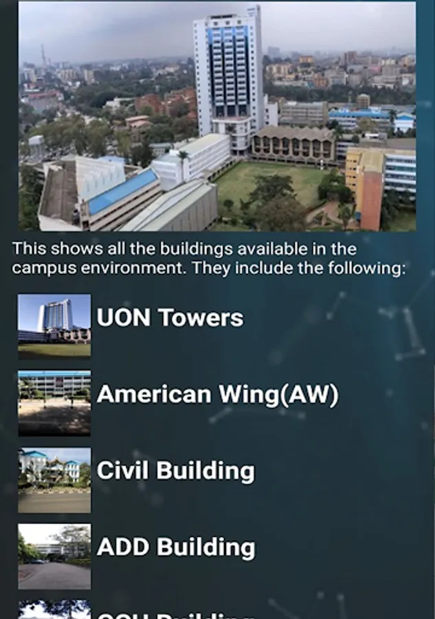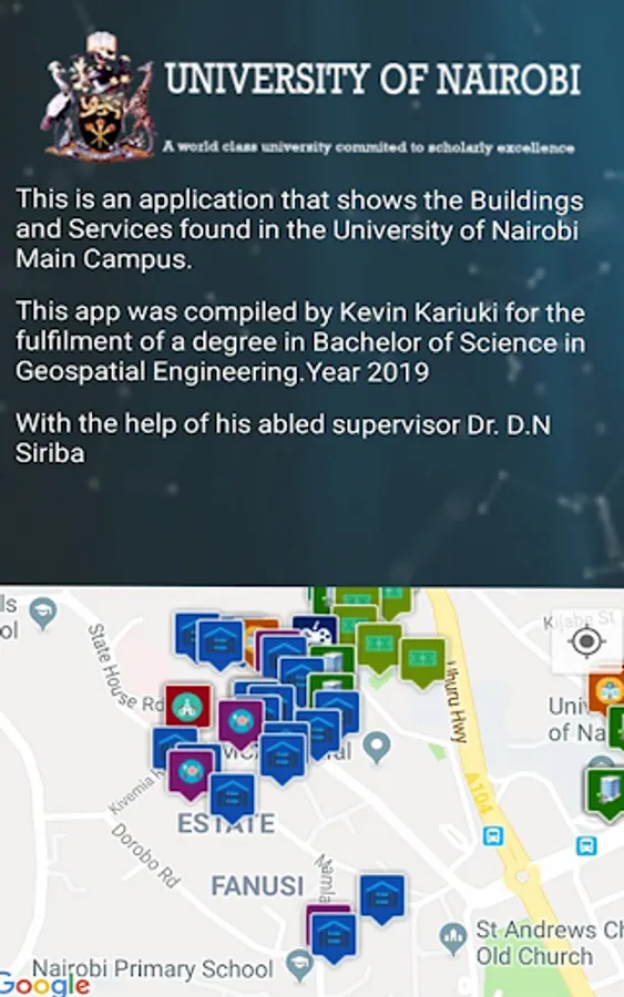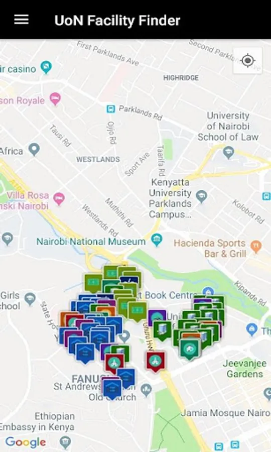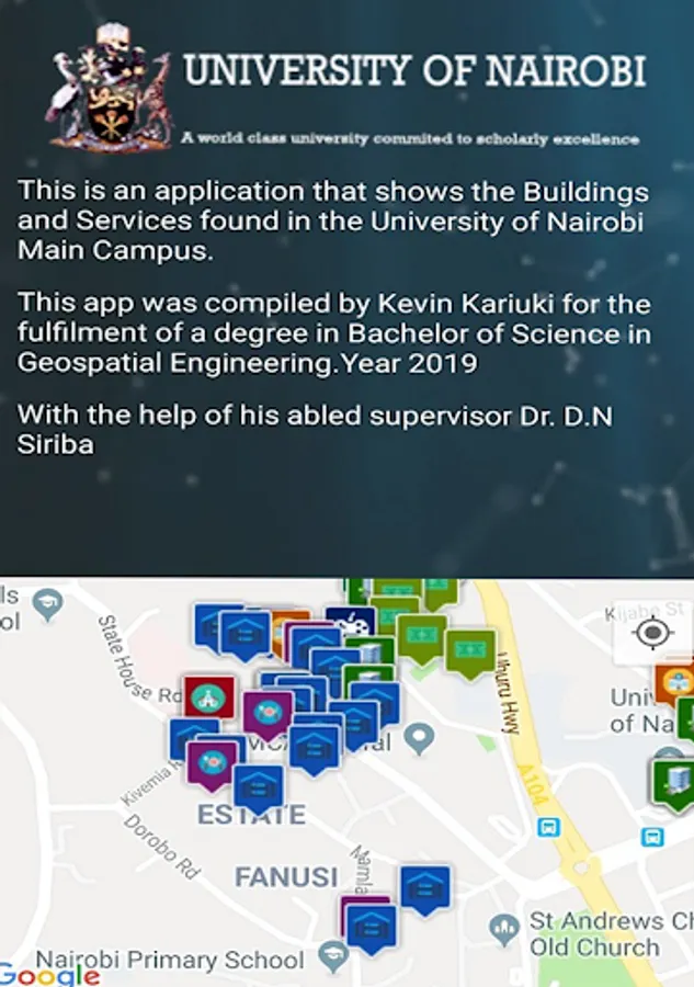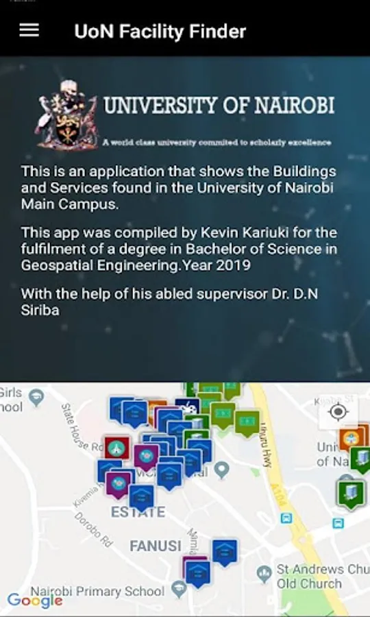 This is a Facility Finder for The University of Nairobi Main Campus. It shows directions, descriptions and images of buildings in the vicinity of the Campus Environment. It is a tool that ensures visitors and students especially newly admitted students find they way around the campus. It has a simplified and easy to use Interface.