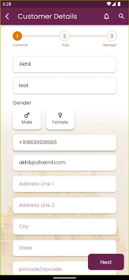 After or during call with the customer, the pujari then corrects the customer details and enters any additional information like date of birth.