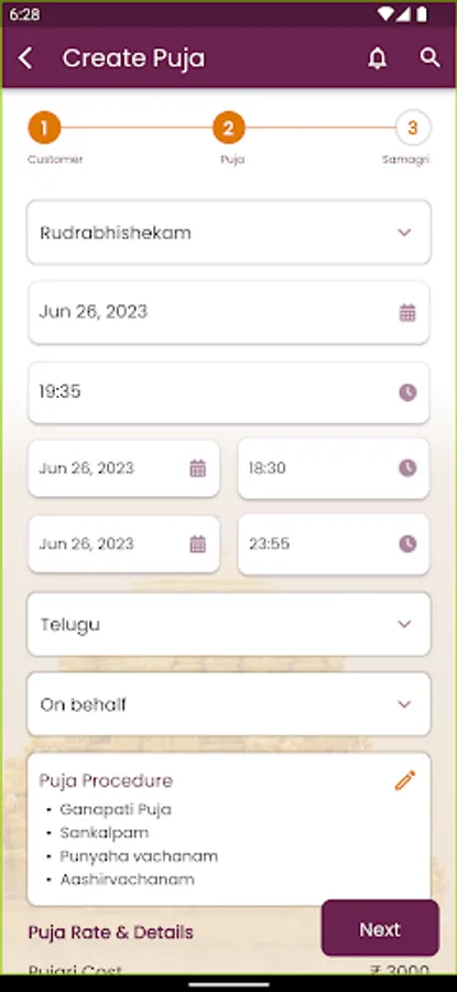 The pujari can also edit samagri and procedure details of the puja and enter the appropriate amount and duration.