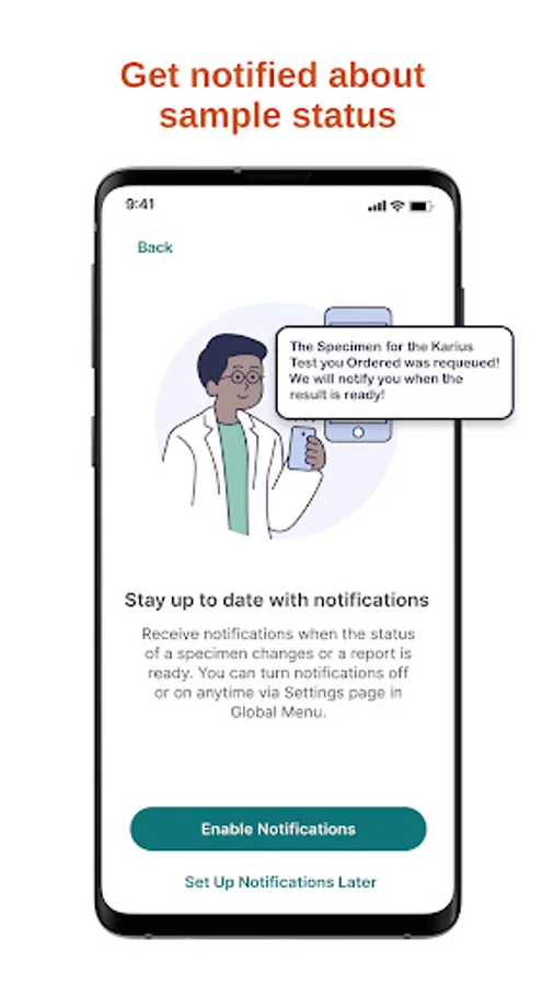The app enables you to easily view Karius Test results and stay up-to-date on the status of orders.