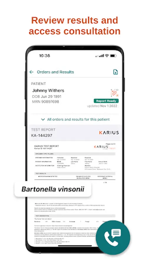 The app enables one-touch access to the Karius team 24/7 via text or call to discuss results or get the status of an order.