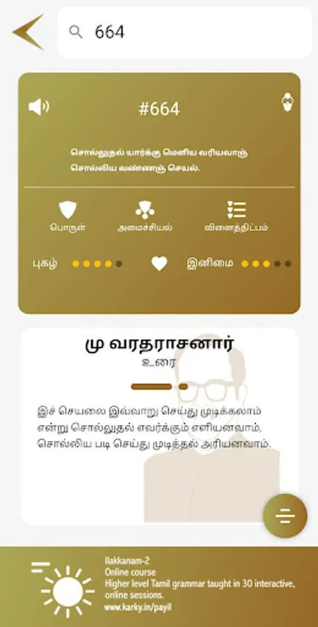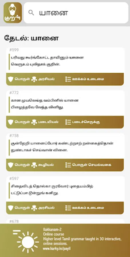 Kural App is the best app to browse Kurals. Kural app provides a rich set of features for you to explore Thiruvalluvar's timeless classic. You can search for concepts in Tamil or English. You can search for concepts instead of keywords. Audio is provided for all Kurals. Four different interpretations are available in the app for you to understand the verses from different view points.