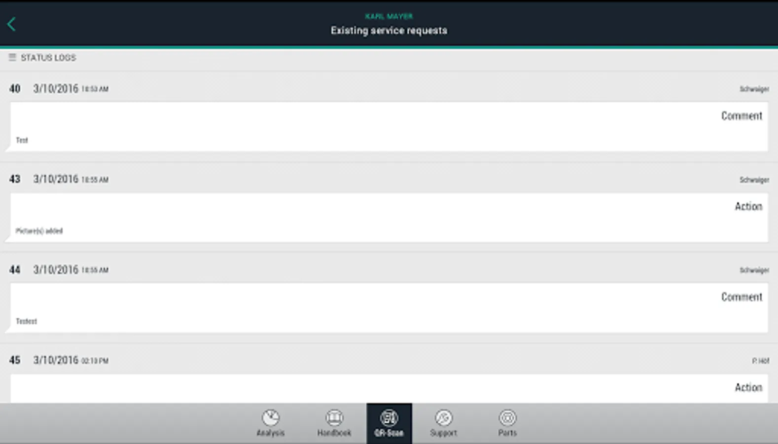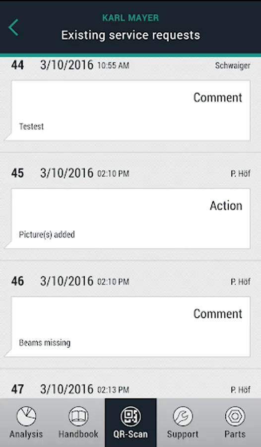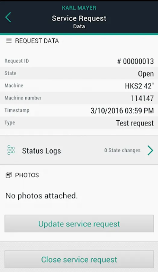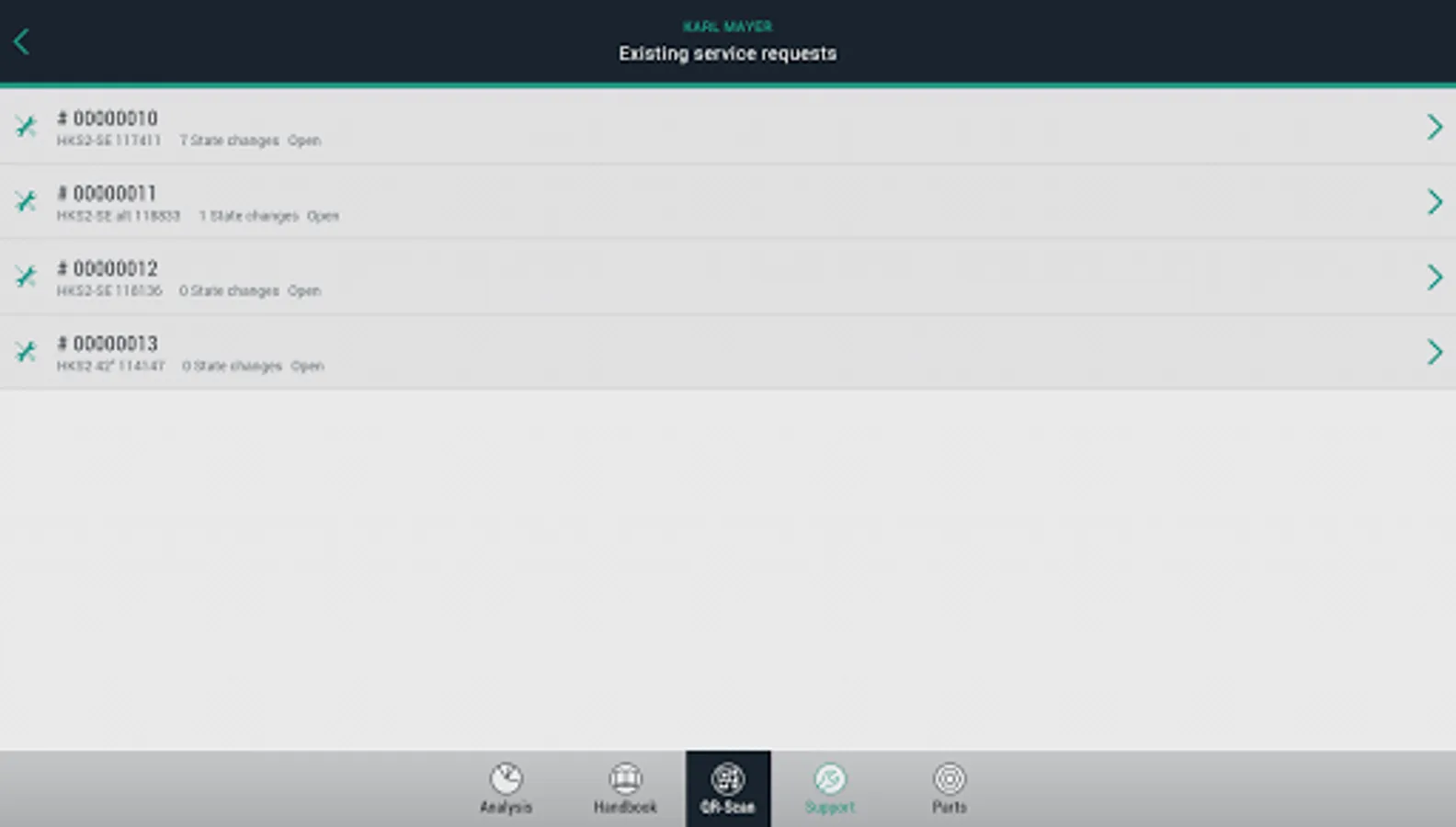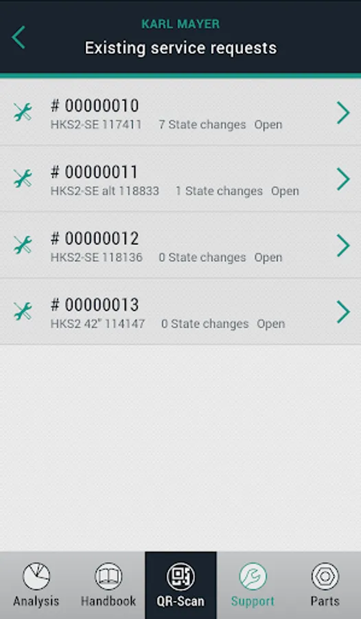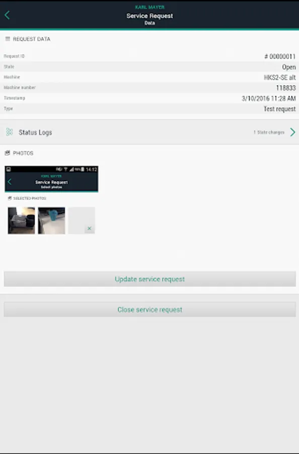 • You can also send off a service request and a QR code but with a more extensive package of machine data. There is also an option to insert photos and comments into the service request.