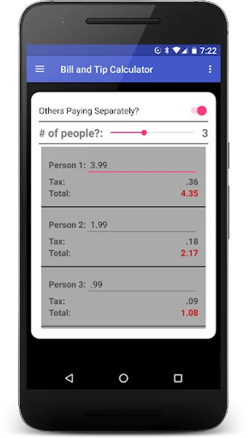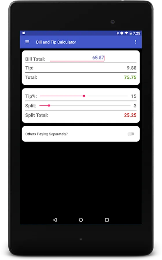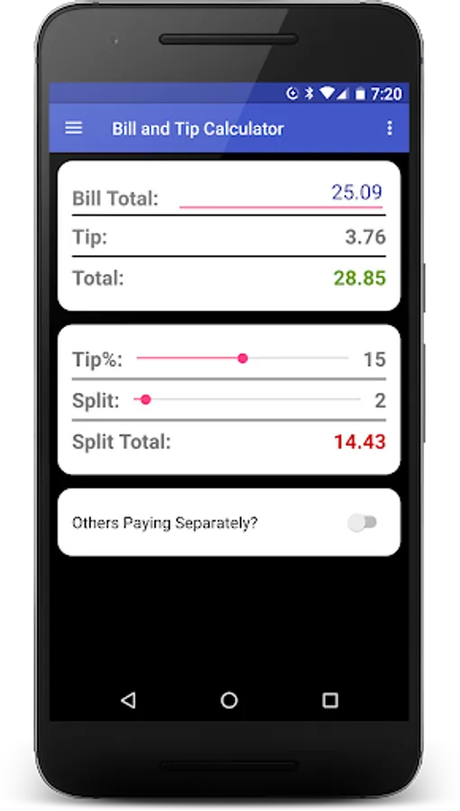 Quickly calculate tip amount and split bill among friends. You can also calculate other people paying separately that have a smaller bill.