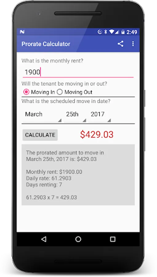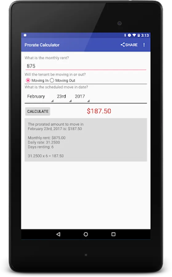Prorate Calculator easily helps you calculate daily rental rate beginning of a month and the prorated rent amount for the tenant moving in or out in the middle of the month. Great for home, room and storage unit rentals.
