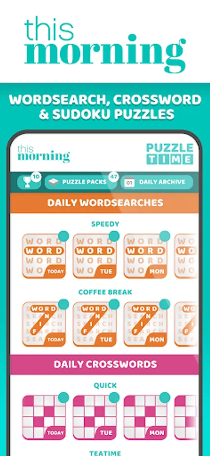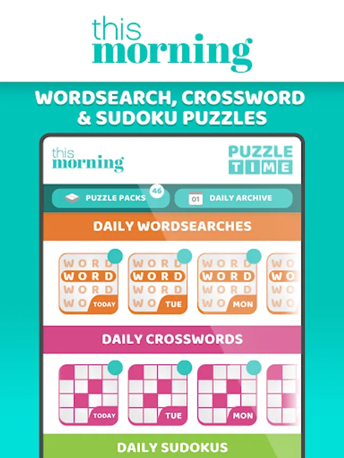 Puzzle Time from ITV’s This Morning is a free daily puzzle game app that offers a wide range of Crossword, Wordsearch and Sudoku puzzles for both novice and advanced players.