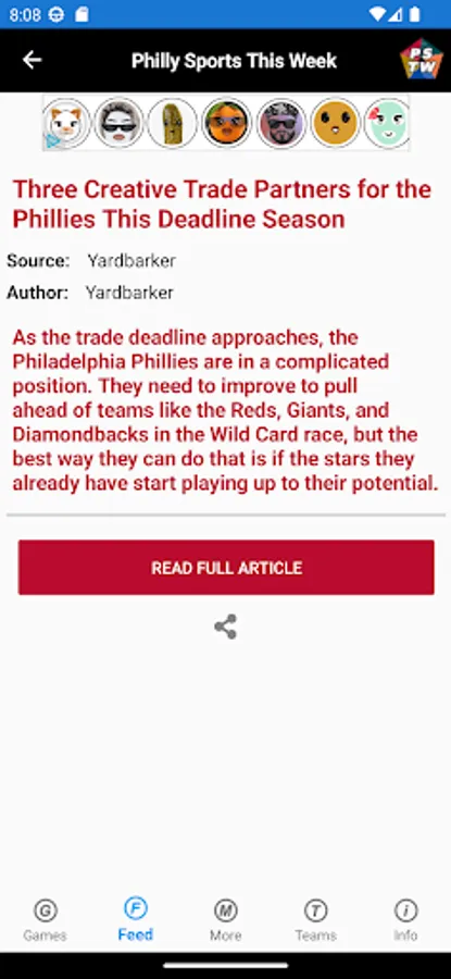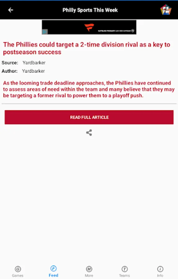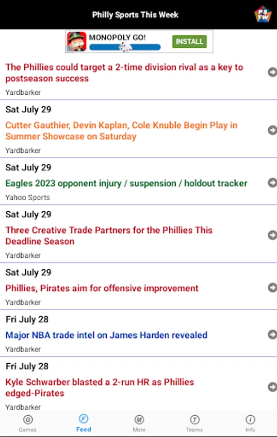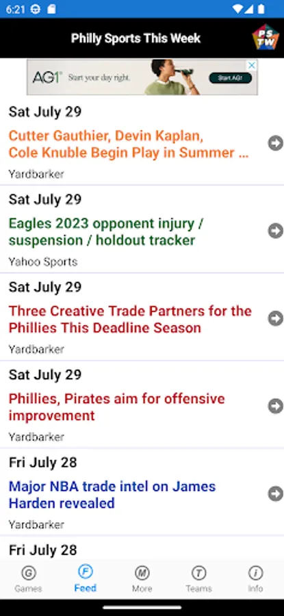 The Feed page displays the latest headlines for the teams from various RSS feeds.