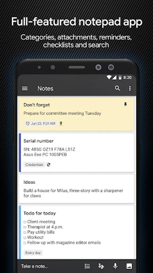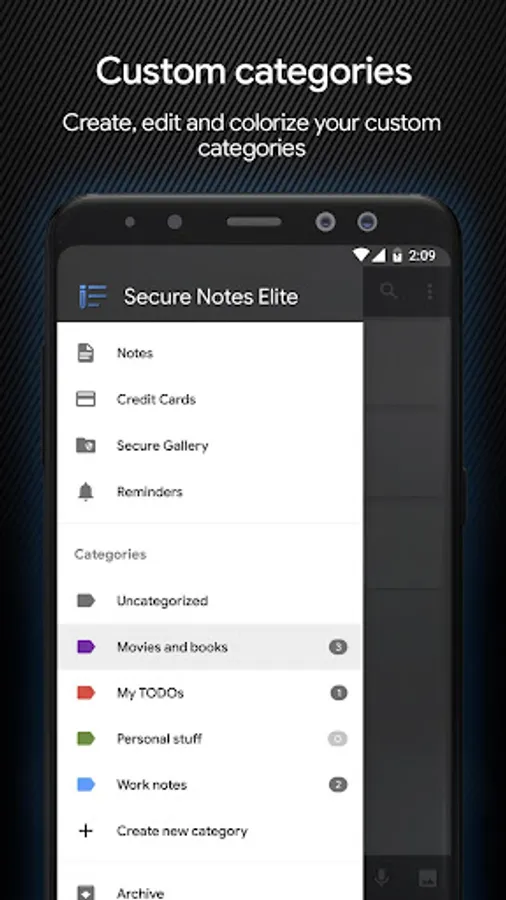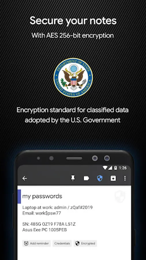 ✔ It's a full-featured notepad app with categories, attachments, reminders, search and professional encryption. The military-grade AES 256-bit encryption guarantees that your data is safe no matter what.