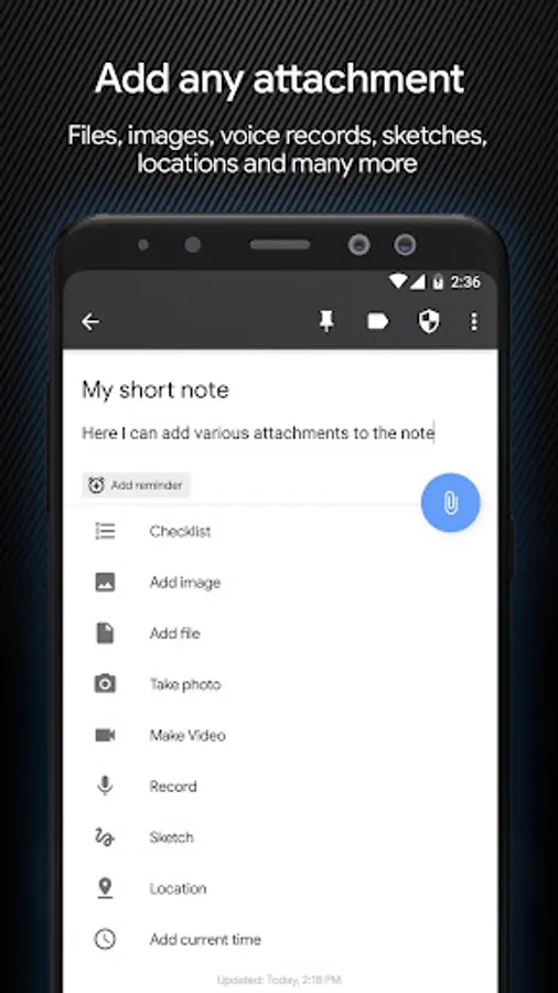• Add attachments: images, videos, files, location, sketches, voice recording