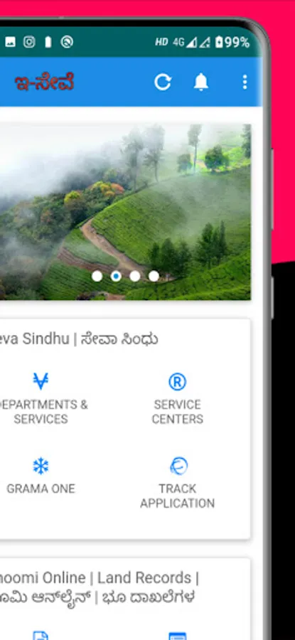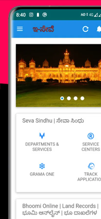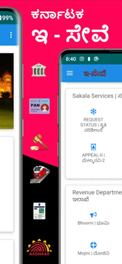 The app aggregates links to websites for popular government services like Seva Sindhu, Karnataka One, Aadhar, PAN, BESCOM, BWSSB, Passport, Police and Ration services and displays this information inside a mobile browser.