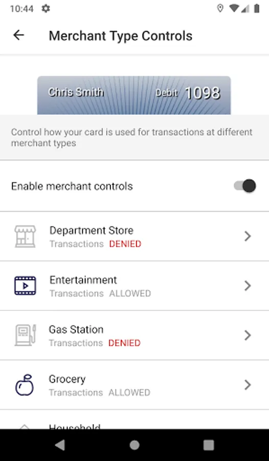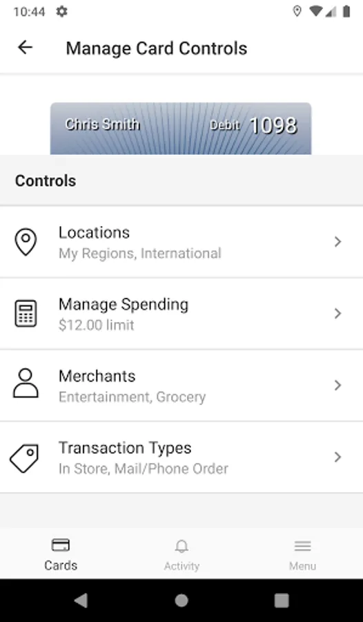 Set spending limits to decline transactions above your thresholds. Monitor activity by category such as gas stations and restaurants, and by type: in-store purchases, e-commerce transactions and ATM transactions.