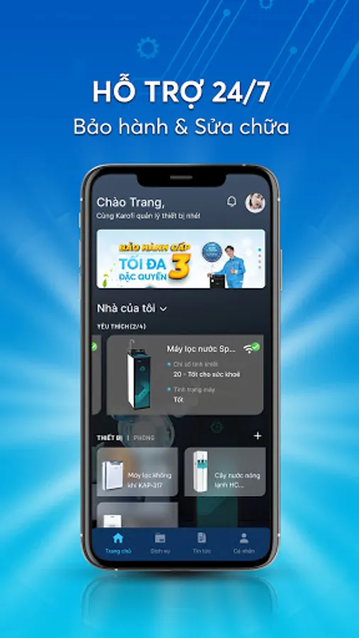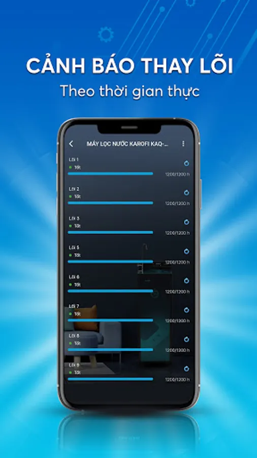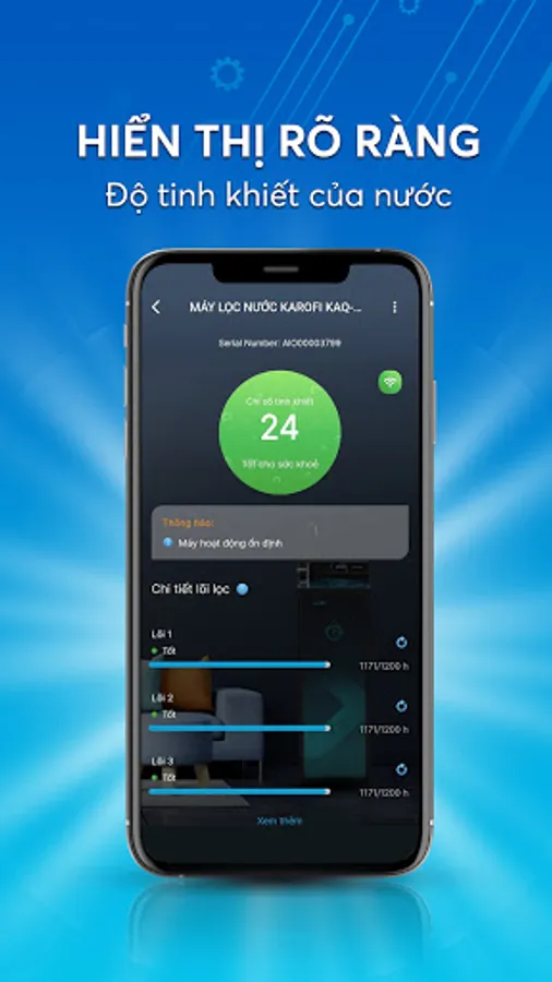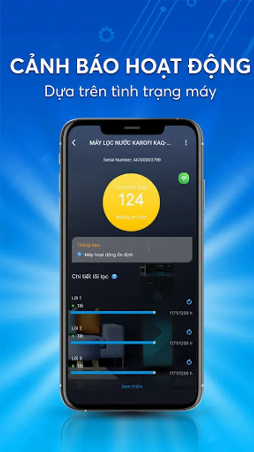 For the first time in Vietnam, you can monitor your water purifier anytime, anywhere through the Karofi 365 App. The app includes features including: