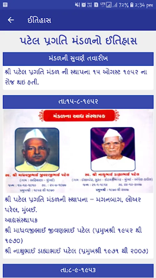 શ્રી પટેલ પ્રગતિ મંડળની સ્થાપના – મગનબાગ, લોઅર પરેલ, મુંબઈ. આદ્યસંસ્થાપક શ્રી માધવજીભાઈ જીવણભાઈ પટેલ (પ્રમુખશ્રી ૧૯૫૨ થી ૧૯૭૦) શ્રી નાથુભાઈ ડાહ્યાભાઈ પટેલ (પ્રમુખશ્રી ૧૯૭૧ થી ૨૦૦૭).શ્રી પટેલ પ્રગતિ મંડળ ની સ્થાપના ૧૫ ઓગસ્ટ ૧૯૫૨ ના રોજ થઇ હતી.શ્રી પટેલ પ્રગતિ મંડળની પ્રથમ વાર્ષિક સાધારણ સભા. સમારંભના પ્રમુખશ્રી લાલુભાઈ મકનજીભાઈ પટેલ. માજી ધારાસભ્ય, મુંબઈ.