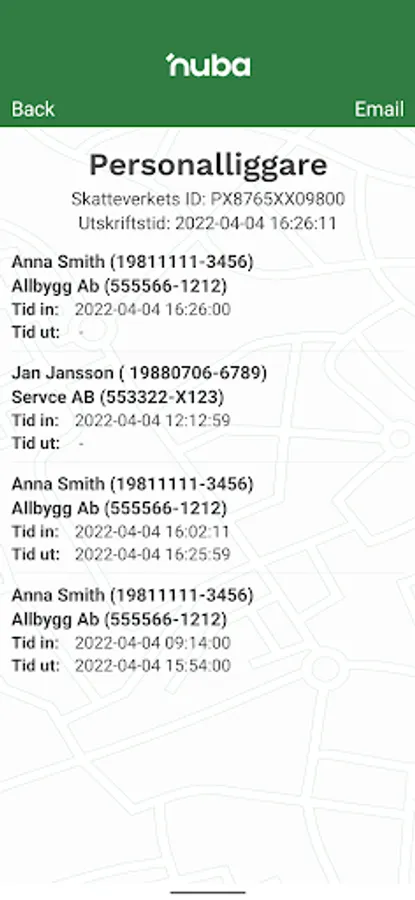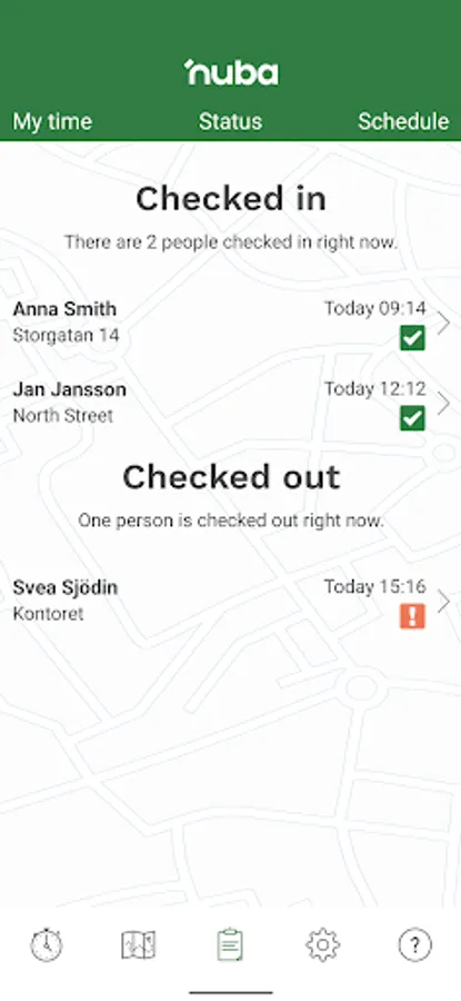 Nuba is also a staff ledger, fully compliant with Skatteverket rules and regulations. You won't find a more user friendly and capable solution, without any additional hardware needed. Time and staff ledger reporting is done with a single tap, and anyone who is checked in at the location can pull up the staff ledger right in the app if Skatteverket pays a visit.