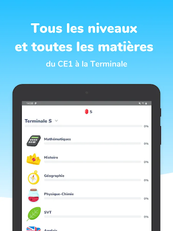 • 14 subjects >> Mathematics, French, History, Geography, ECS, Physics-Chemistry, SVT, English, German, Spanish, SES, Philosophy, Literature, Scientific Education.