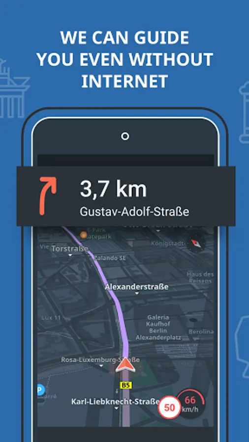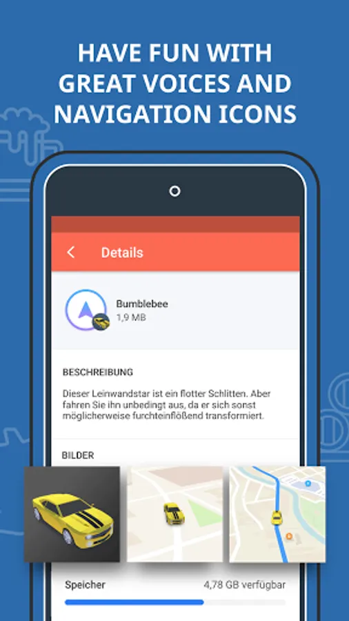 Download Germany’s map or any other country in the world, customize your GPS Navigation experience with a funny voice and navigate on screen using a sports car, a police vehicle or even a spaceship.