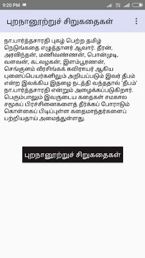 Na.Parasari is a well-known Tamil writer. Deepam, Aravindan, Manivannan, Ponmudi, Reshavan, Kadalazhagan, Nilamburanan, Sengulam Weerasinghe Kavirayar is known for his literary work as Deepam. Often his stories are about policy-makers who struggle to solve contemporary social problems.