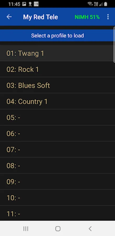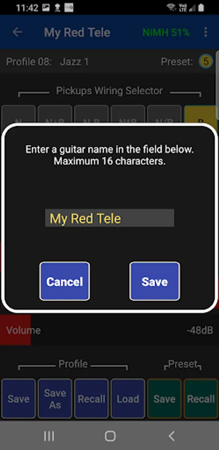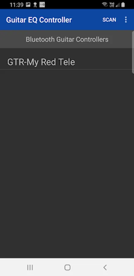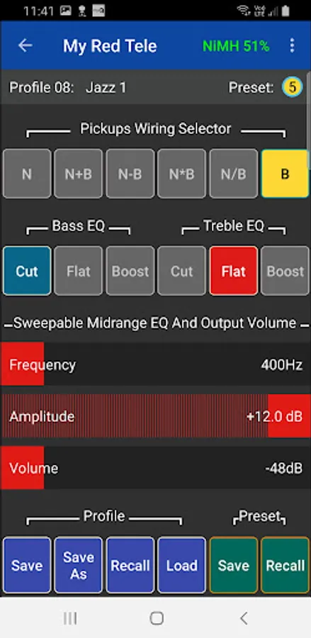 The app controls a programmable preamp installed in a guitar using Bluetooth communication.