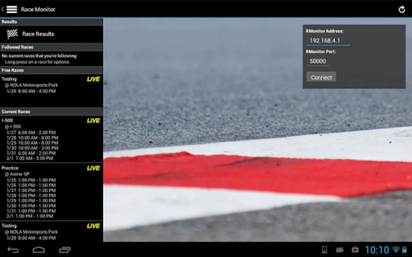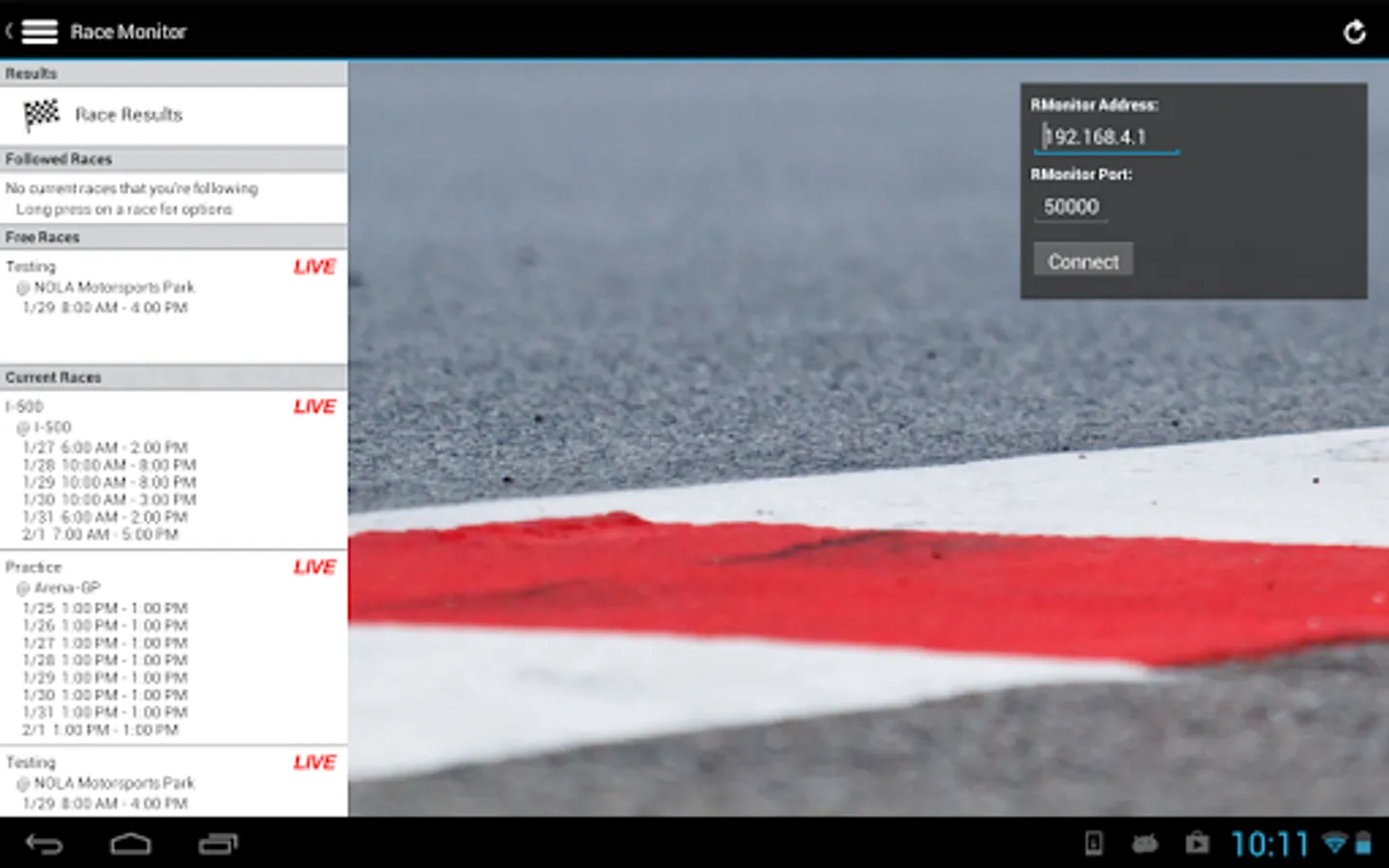 ** Connections directly to an RMonitor server provided by a track may require that you be connected to the track's wireless network **