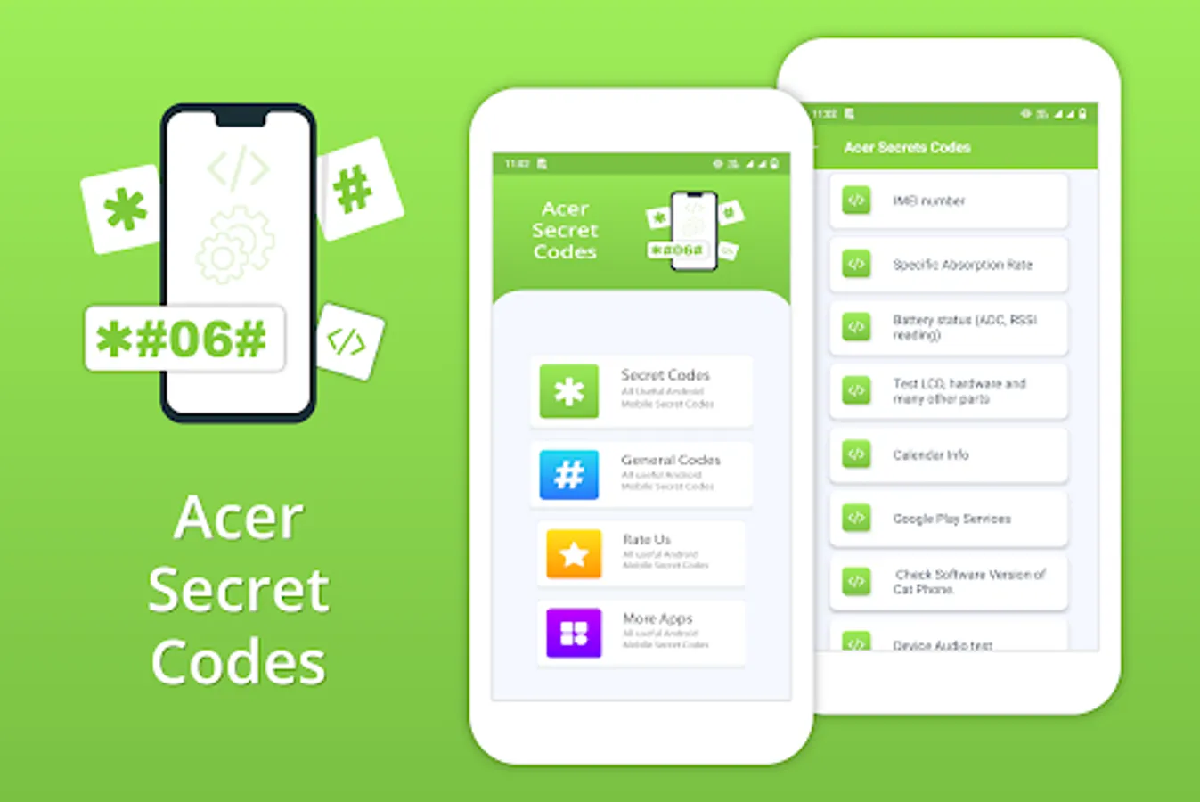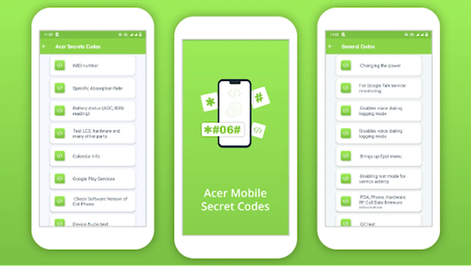 In all ACER Mobile Codes, you can find all the Android secret codes including Network, GPS, Bluetooth, WLAN testing, Firmware version details, factory tests, PDA, show IMEI number, Advanced Mode, Service Menu, Check Update, Reset Device, Unlock Device, Restore Forgotten Pattern, Engineering Mode, GPS Test Mode, Machine Information, Software Information, Hardware Information, Test Photograph RGB and much more.