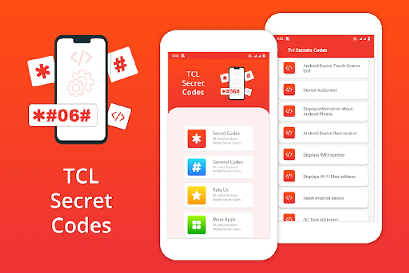 In all TCL Mobile Codes, you can find all the Android secret codes including Network, GPS, Bluetooth, WLAN testing, Firmware version details, factory tests, PDA, show IMEI number, Advanced Mode, Service Menu, Check Update, Reset Device, Unlock Device, Restore Forgotten Pattern, Engineering Mode, GPS Test Mode, Machine Information, Software Information, Hardware Information, Test Photograph RGB and much more.