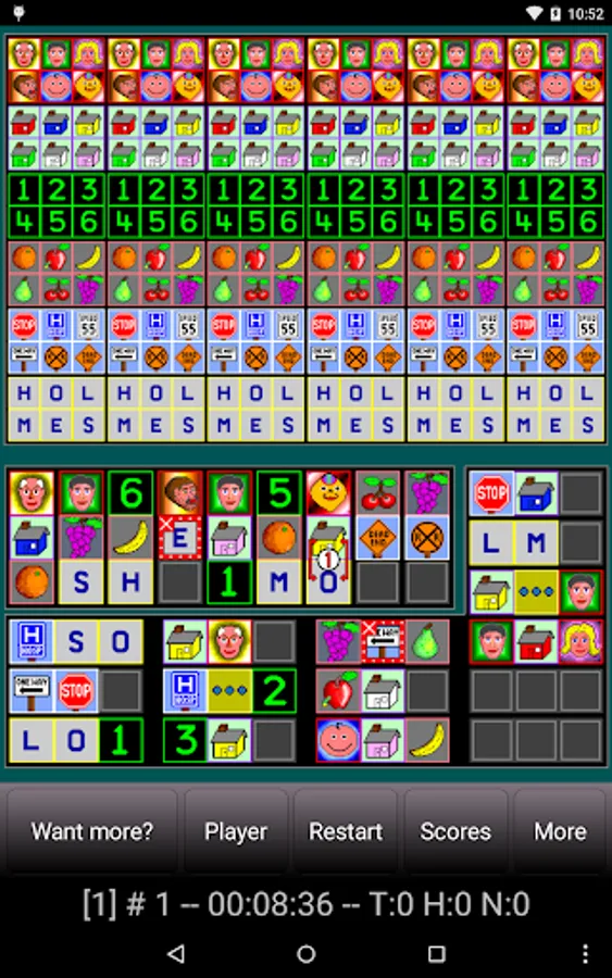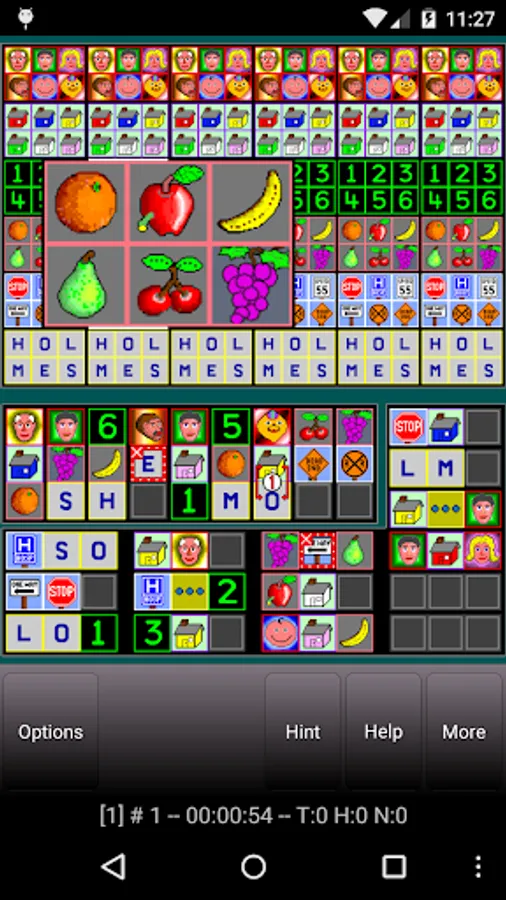 Sherlock is a computerized version of logic puzzles, where you're presented with a series of clues that help you to determine the exact locations of all of the images on the playing board. The puzzles are all 4x4, 5x5 or 6x6. Each row of the playing board contains images of the same type (faces, houses, numbers, fruit, street signs, letters, etc). The game scrambles the locations of the items in each row (without showing you their locations) and then presents to you a set of graphical clues that describe the positional relationships of different images. You use the clues to deduce where things can't be (and where they HAVE to be) until you know where all of the images are located.