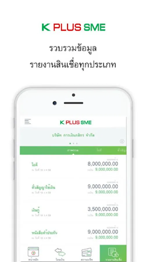 มากกว่า.. ด้วยฟังก์ชัน “รายงานสินเชื่อ” ที่รวบรวมข้อมูลสินเชื่อ ได้แก่ โอดี, ตั๋วสัญญาใช้เงิน, เงินกู้ และ หนังสือค้ำประกัน เพื่อให้คุณไม่พลาดการบริหารจัดการทางการเงิน