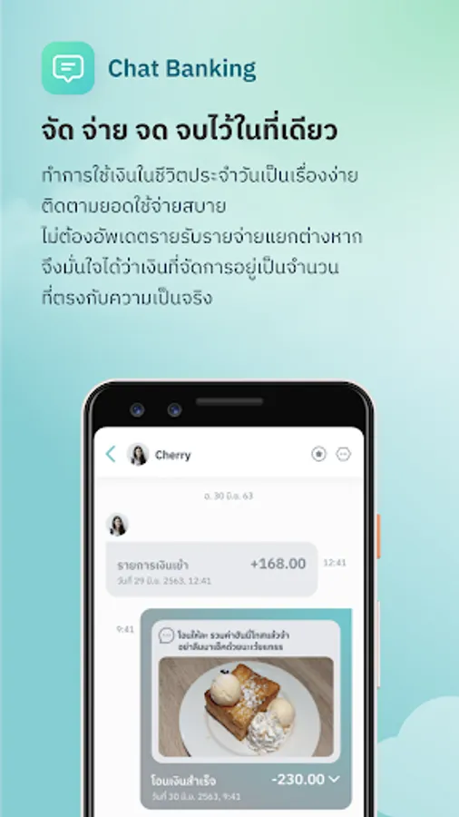 2. Chat Banking: การแสดงประวัติรายการในรูปแบบแชท รายการที่ไม่ต้องตีความ หมดยุคของเลขบัญชี xxx-x-xxxxx-x ที่ไม่รู้ว่าของใคร หรือภาษาเเบ้งกิ้งชวนเวียนหัว เพราะ MAKE โชว์รายการในรูปแบบแชทเข้าใจง่าย แยกเป็นรายคน แถมเเนบโน้ตกับรูปได้ด้วย