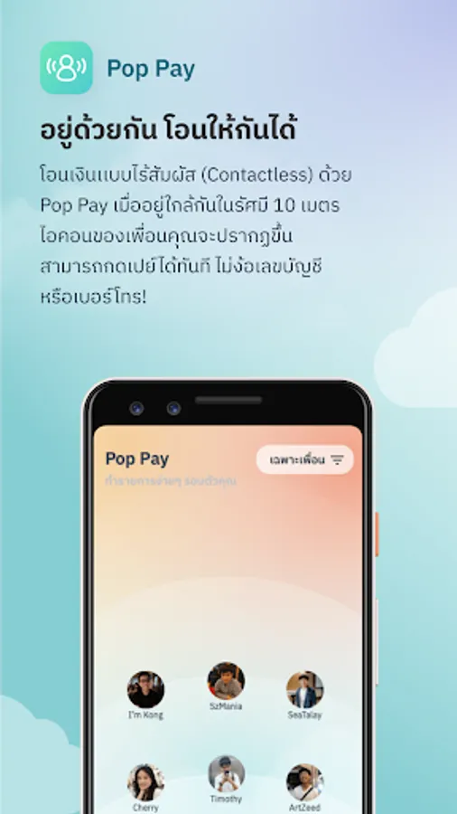 3. Pop Pay: เมื่ออยู่ใกล้กันในรัศมี 10 เมตร ไอคอนของเพื่อนคุณจะปรากฏขึ้น สามารถกดเปย์ได้ทันที ไม่ง้อเลขบัญชีหรือเบอร์โทร!