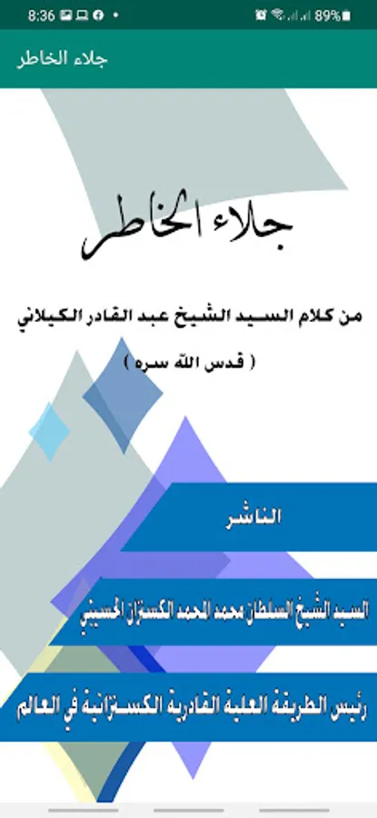 A special application for the book Jala’ al-Khater, and the book of Jala’ al-Khater from the words of Sheikh Abdul Qadir is considered one of the most important books of the Sheikh in Sufism and the call to pure monotheism, and caution against the world and its charms and the desire for the afterlife, and what God has returned to his pious servants, a book published by Mr. Sheikh Caliph Muhammad Muhammad al-Kisanzan Al-Hussaini, the head of the Attic Qadiriyah Kasanzanite Order in the world.