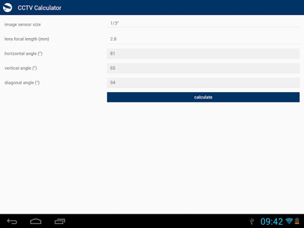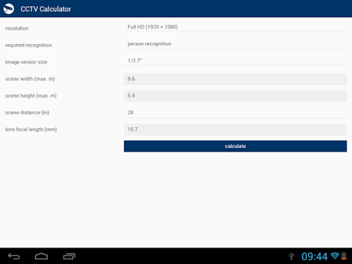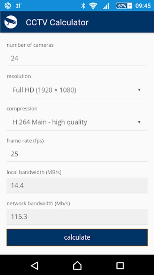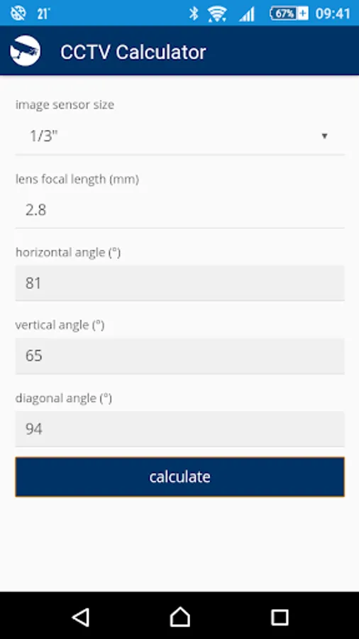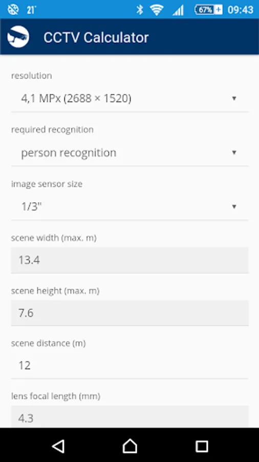 CCTV Calculator is a tool designated for camera system basic parameters determination and testing. It enables easy calculation of an appropriate focal length, camera view, IP camera bandwith, storage capacity for records archiving and of other camera system parameters.