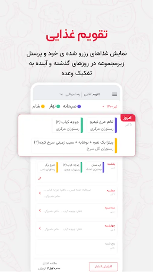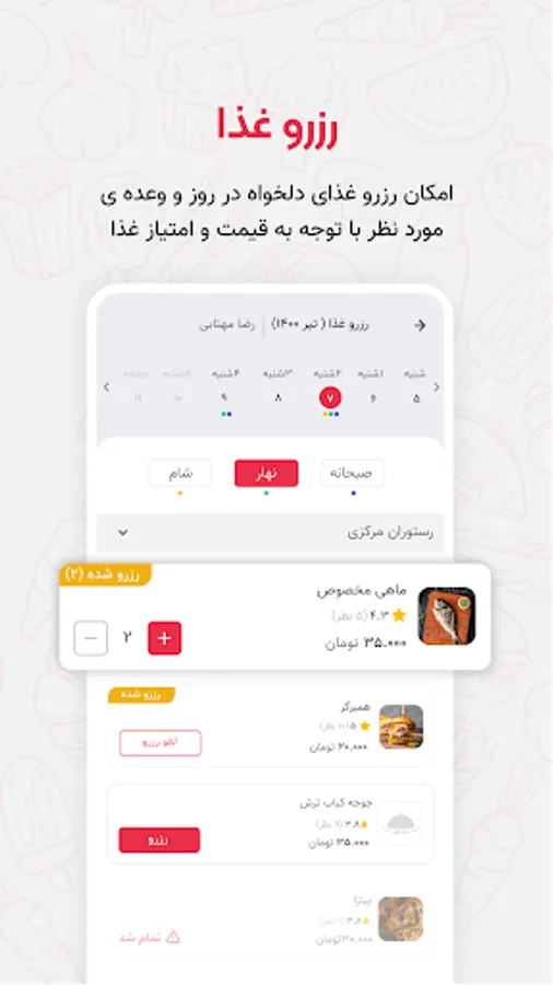 با کسرا فود می توانید غذاهای رزرو شده ی روزهای آینده ی خود را به تفکیک هر وعده مشاهده کنید، از وضعیت سرو یا عدم سرو ررزو روزهای قبلی خود مطلع شوید و غذای مورد نظر خود را در وعده ی دلخواه رزرو نمایید و یا در صورت امکان رزرو های قبلی خود را با مشاهده ی قیمت و امتیازهر غذا ویرایش یا لغو نمایید.