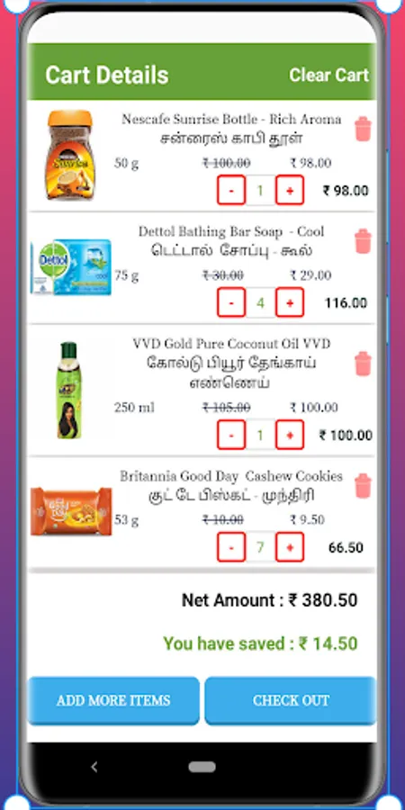 Our products are displayed both in Tamil and English language. Our app supports searching for products in both languages.