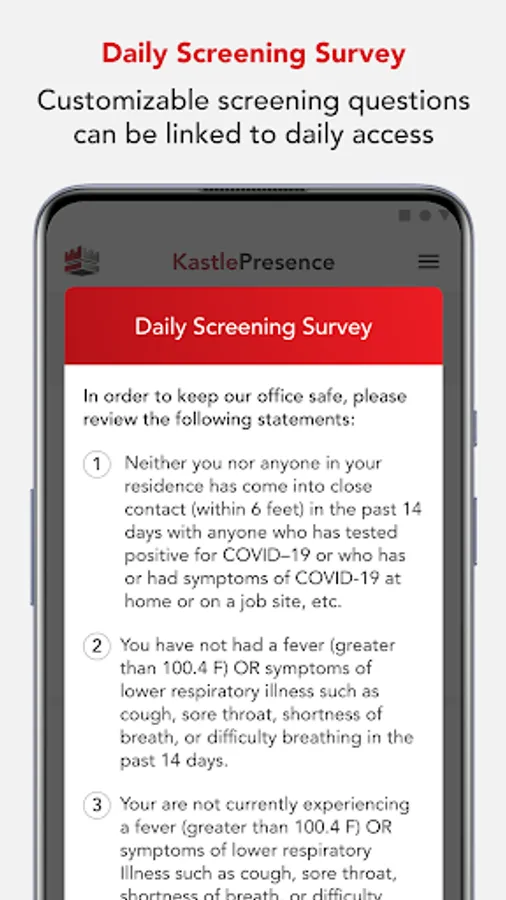 A daily screening survey is available at the start of each day to ensure that only those people meeting the entry criteria are given access to the workspace.