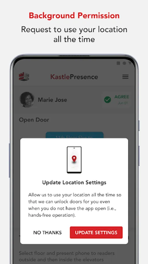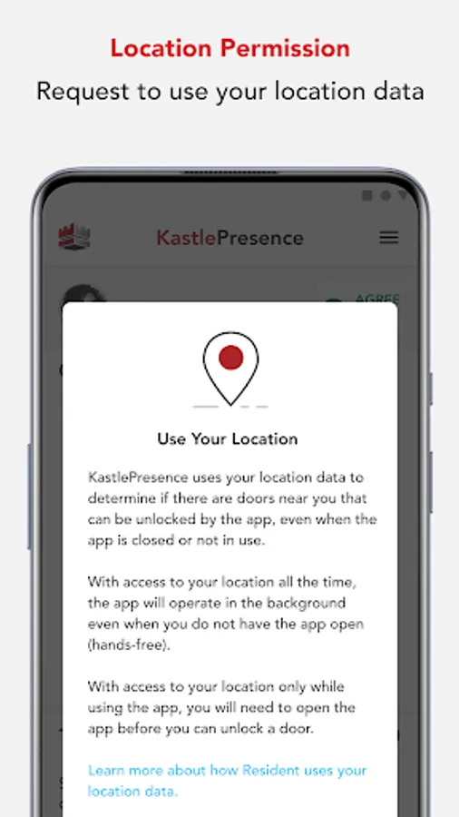 KastlePresence uses Bluetooth technology to turn your mobile device into to a keycard to access your secured office and building and control enabled elevators. With location services turned on, you don’t even have to open your app to unlock a door.