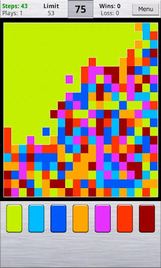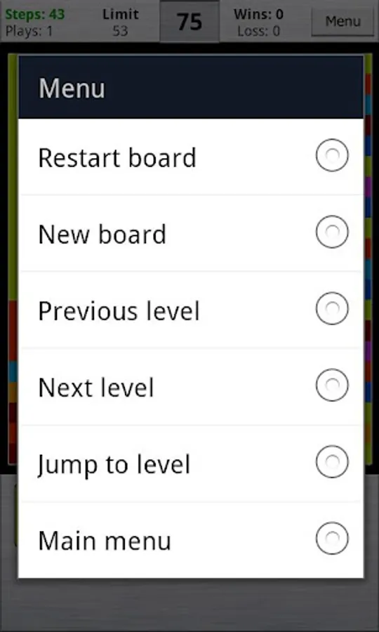 At the top of the playing screen you can also see your statistics: number of plays, wins, loss, minimum number of steps in which you completed level. Those statistics are provided separately for every level!