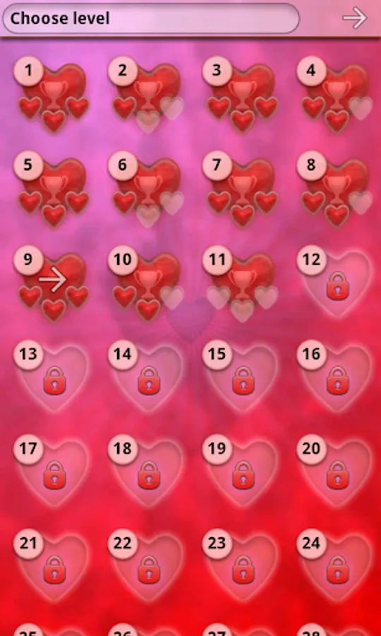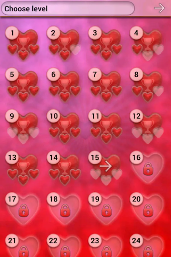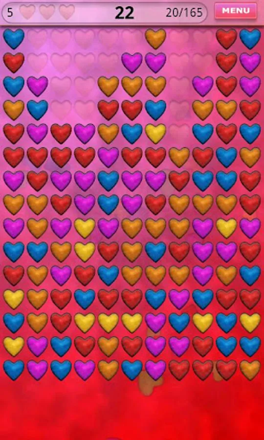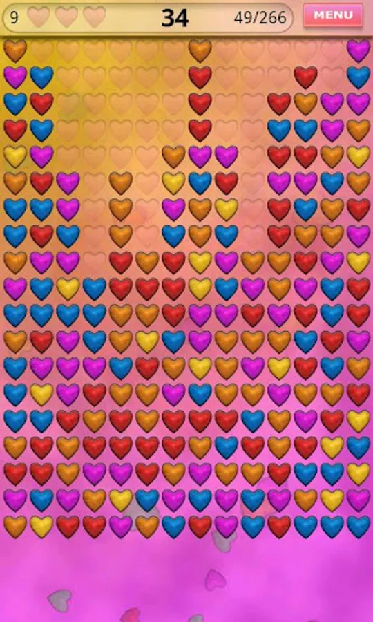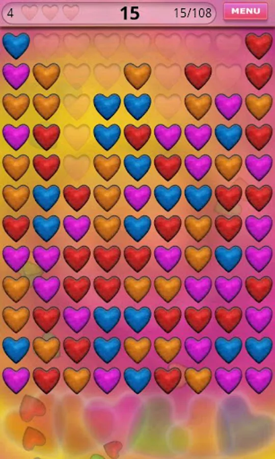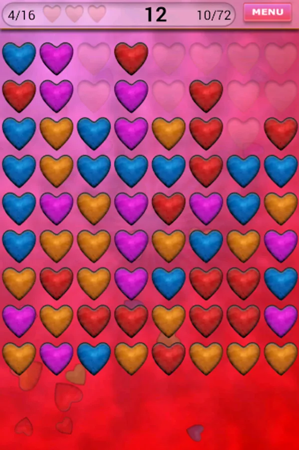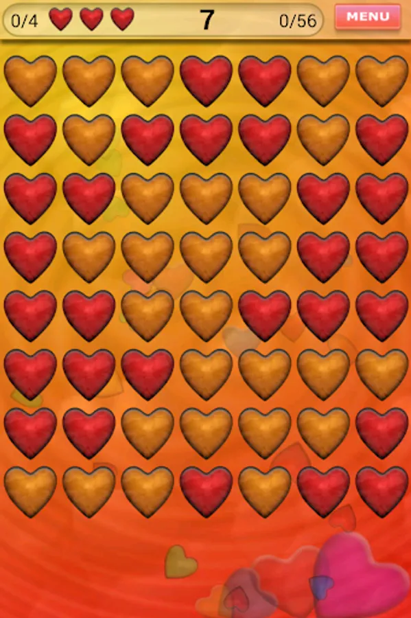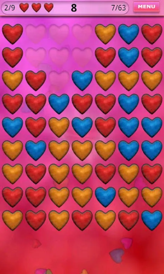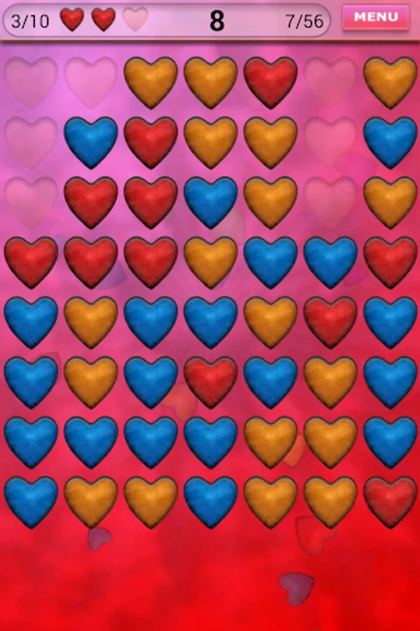 Your aim is to clear the board from all the hearts. Tap at least two identical hearts. They will be removed and other hearts will fall down. If you clear the board you will be rewarded and next level will be unlocked.