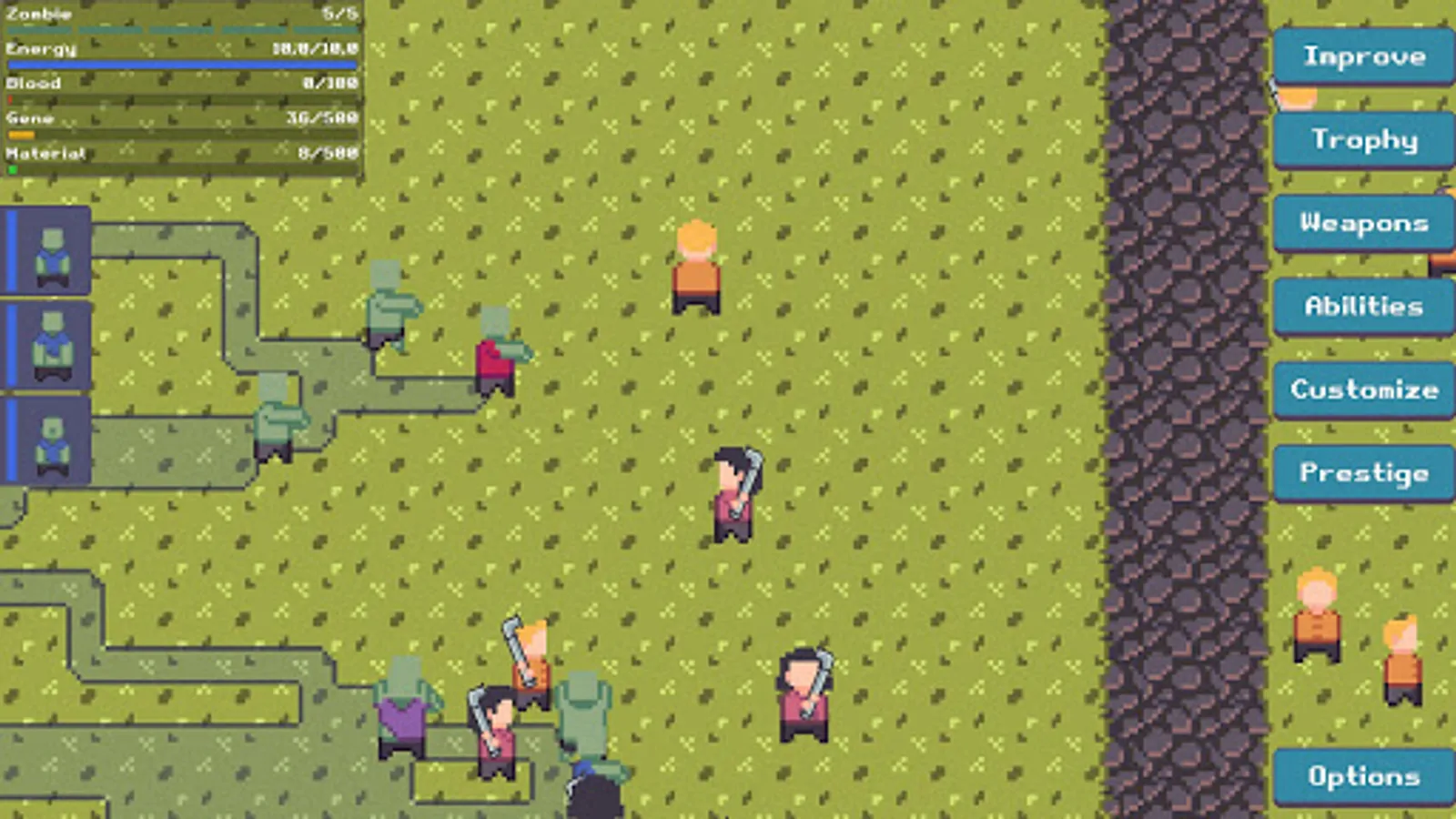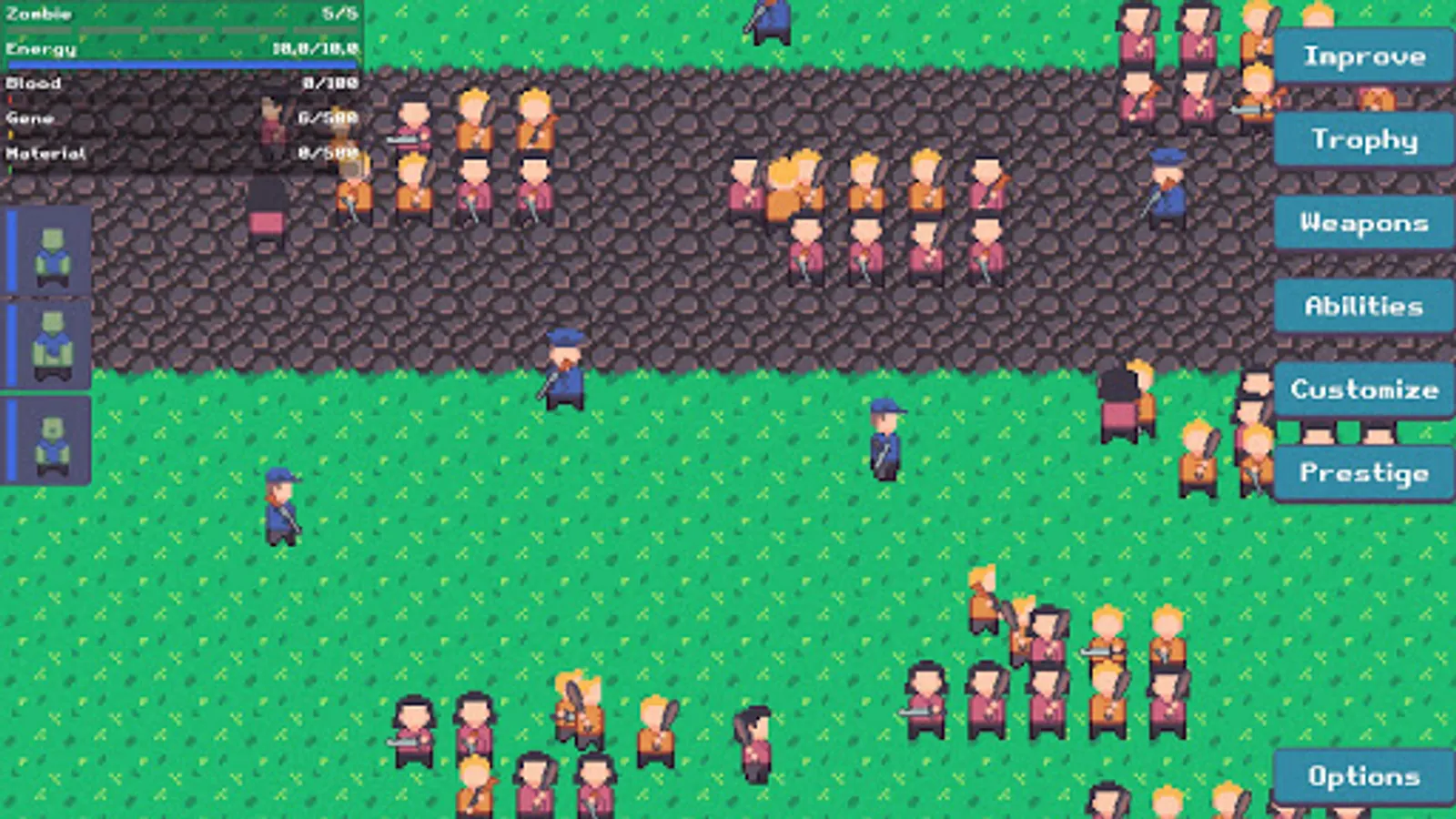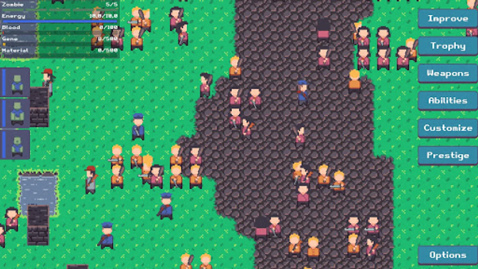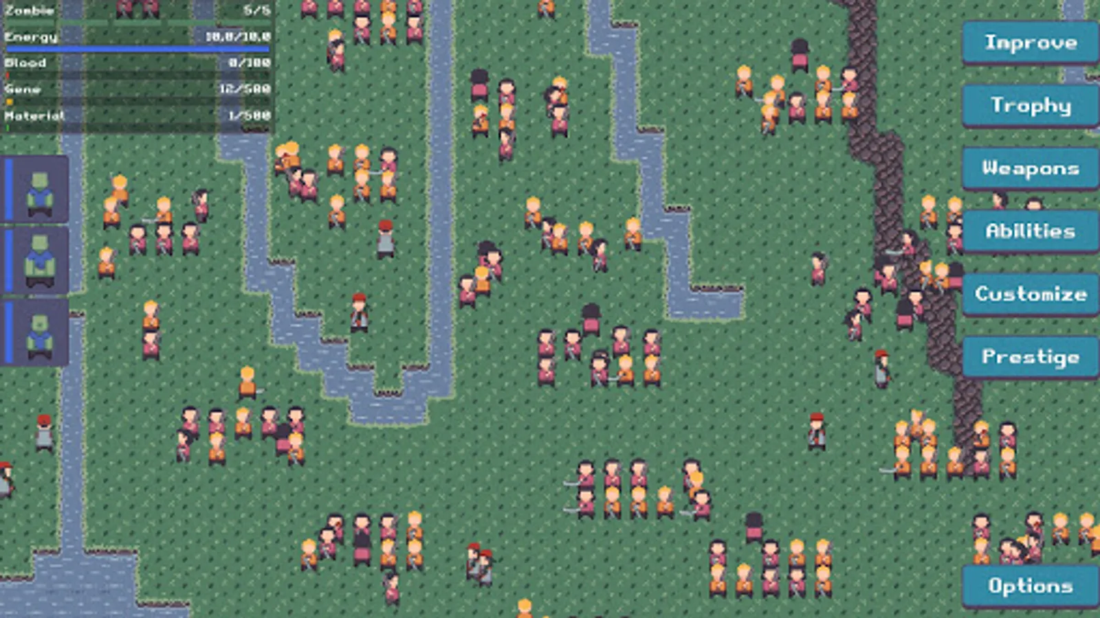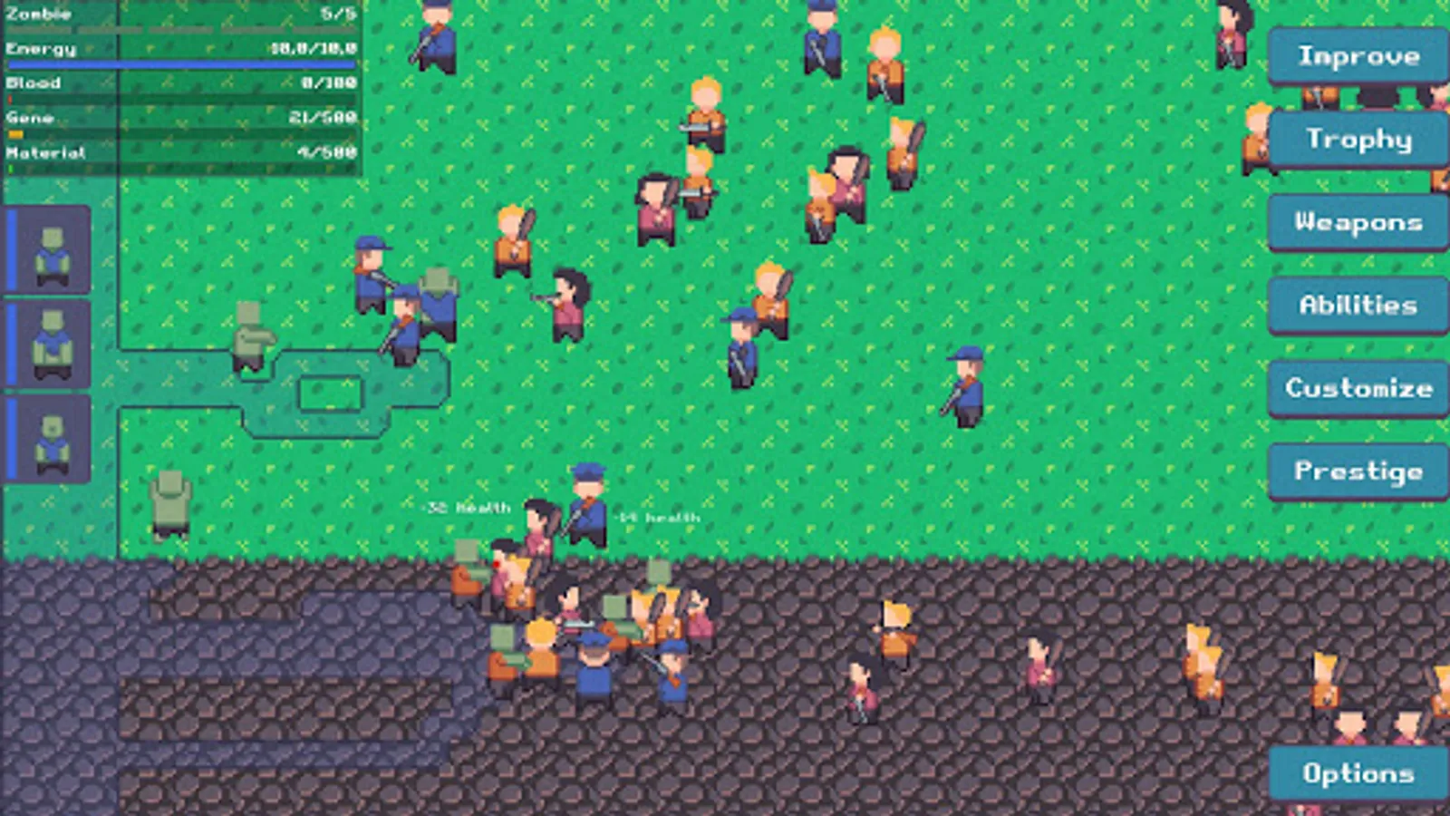 Eliminate all human. Gain resource and improve zombies. 4 type zombies. Unlock new weapons and abilities. And combine them to create the strongest zombie.