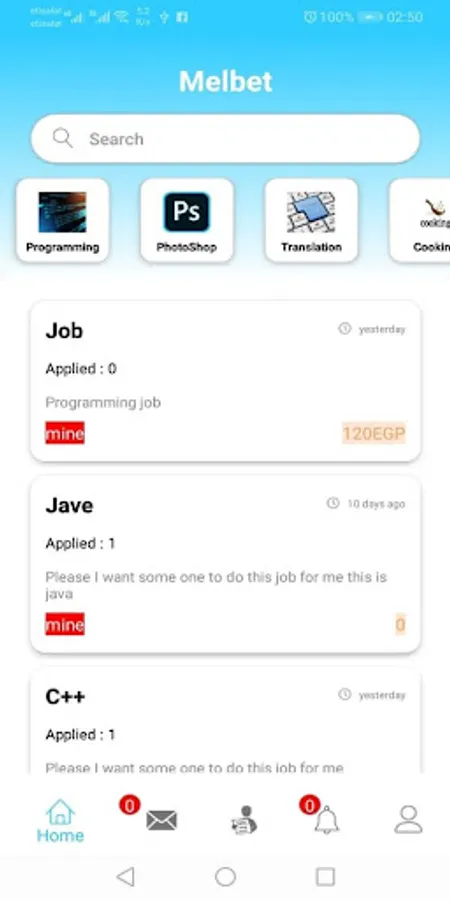 تطبيق من البيت يخلق لك فرصه عمل عن طريق العمل من البيت في مجالات عديدة مثل البرمجه و الفوتوشوب و الترجمه وغيرها من الاعمال القابله للعمل عن بعد فقط افتح التطبيق و اختار المجال ستجد وظائف متاحه قدم في الوظيفه و اكتب عرضا شيقا لتجد صاحب الوظيفه يبدا معك الحديث تحدث معه و ابدئو العمل سويا و في النهائه اطلب منه ان يقيمك ليزداد الانجازات في سجلك