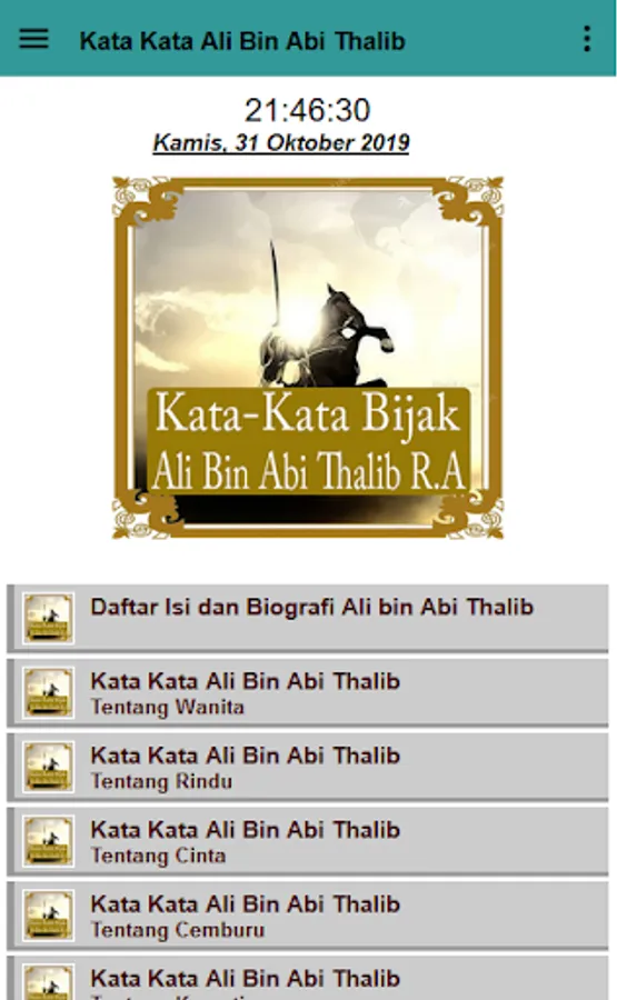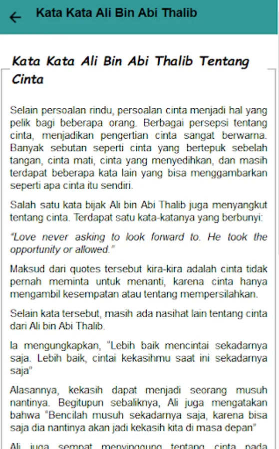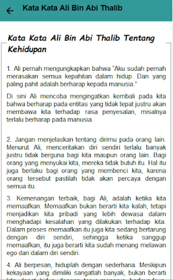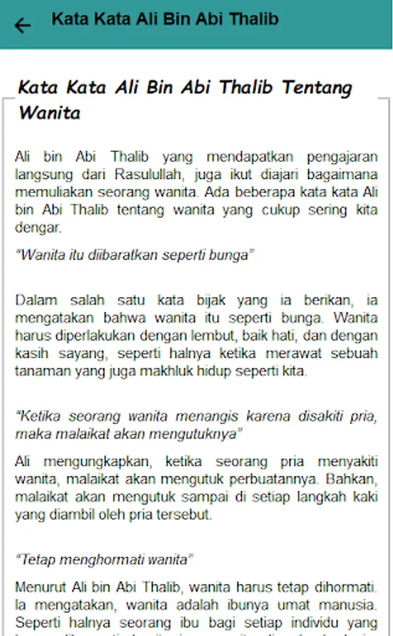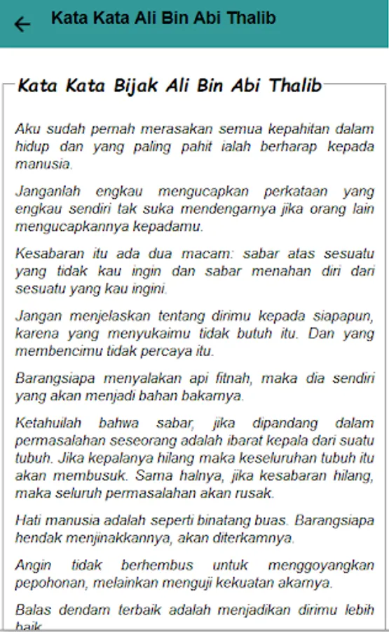 Ali, since childhood he has been known to be smart and brave. He received direct instruction from the Prophet, because they lived together under one roof. Because of his broad insight, he got the nickname "Babul Ilmu" which means "gate of knowledge". Apart from passing on his good qualities, he has also provided words of wisdom full of advice for all of us. Here are a few examples.