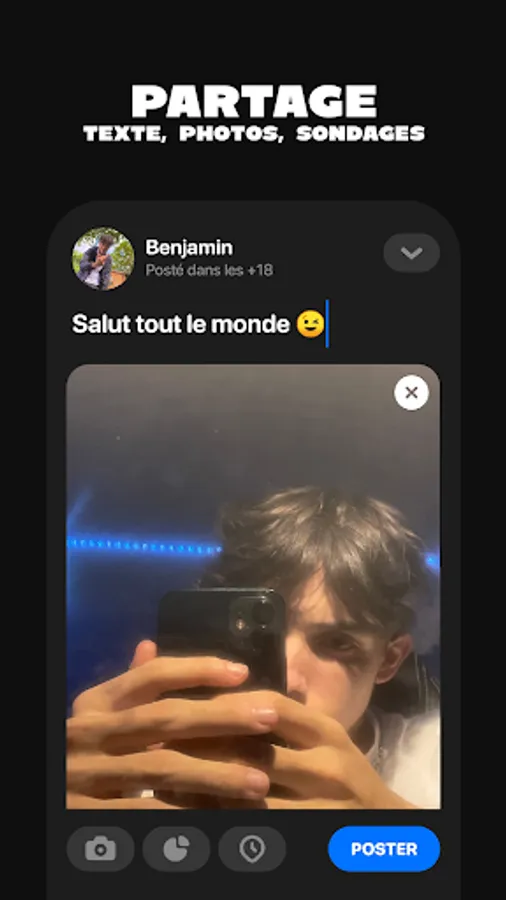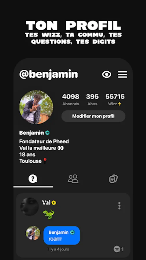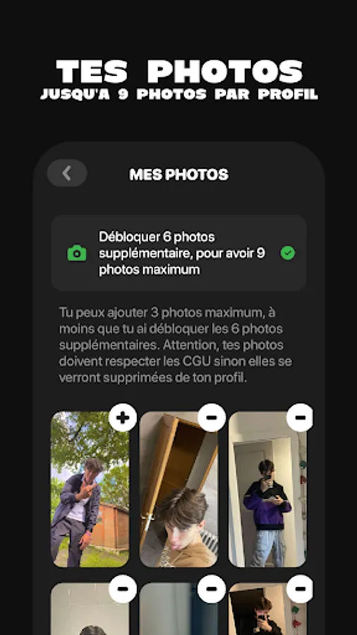 On your profile, you can add a bio, up to 9 profile photos (to show the world how bg you are) and add your networks (Instagram, Snapchat...).
